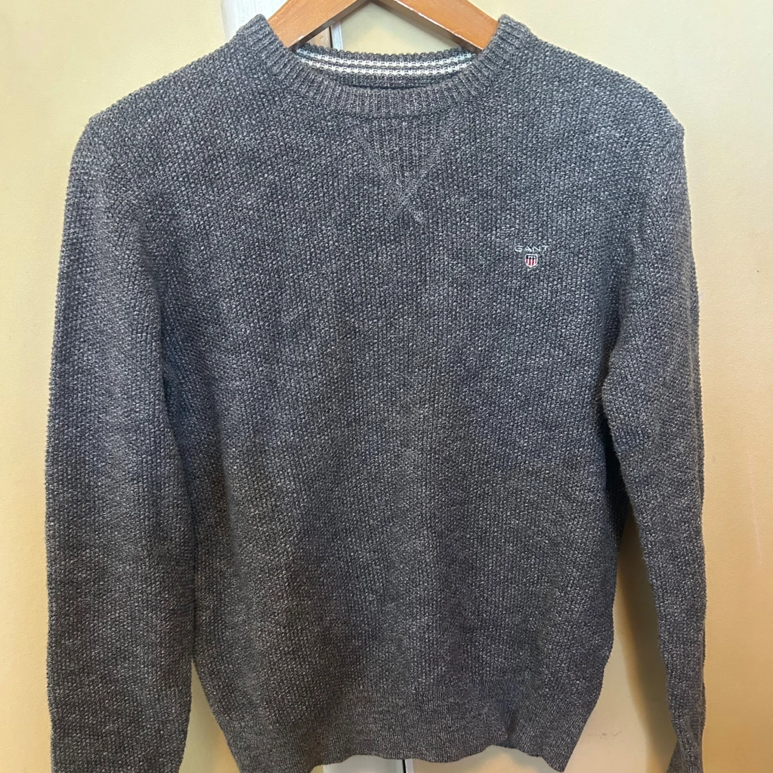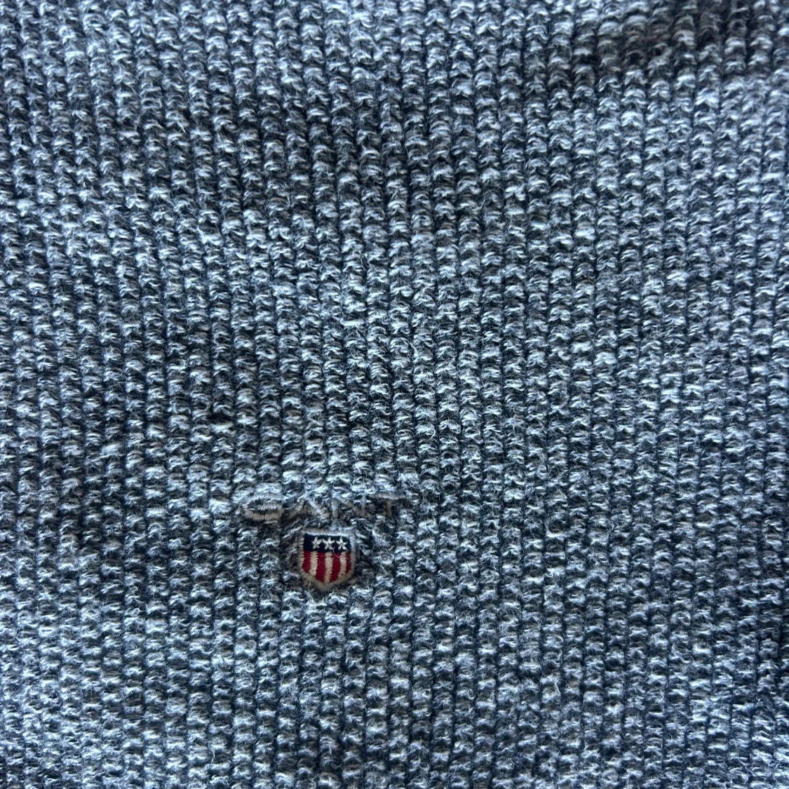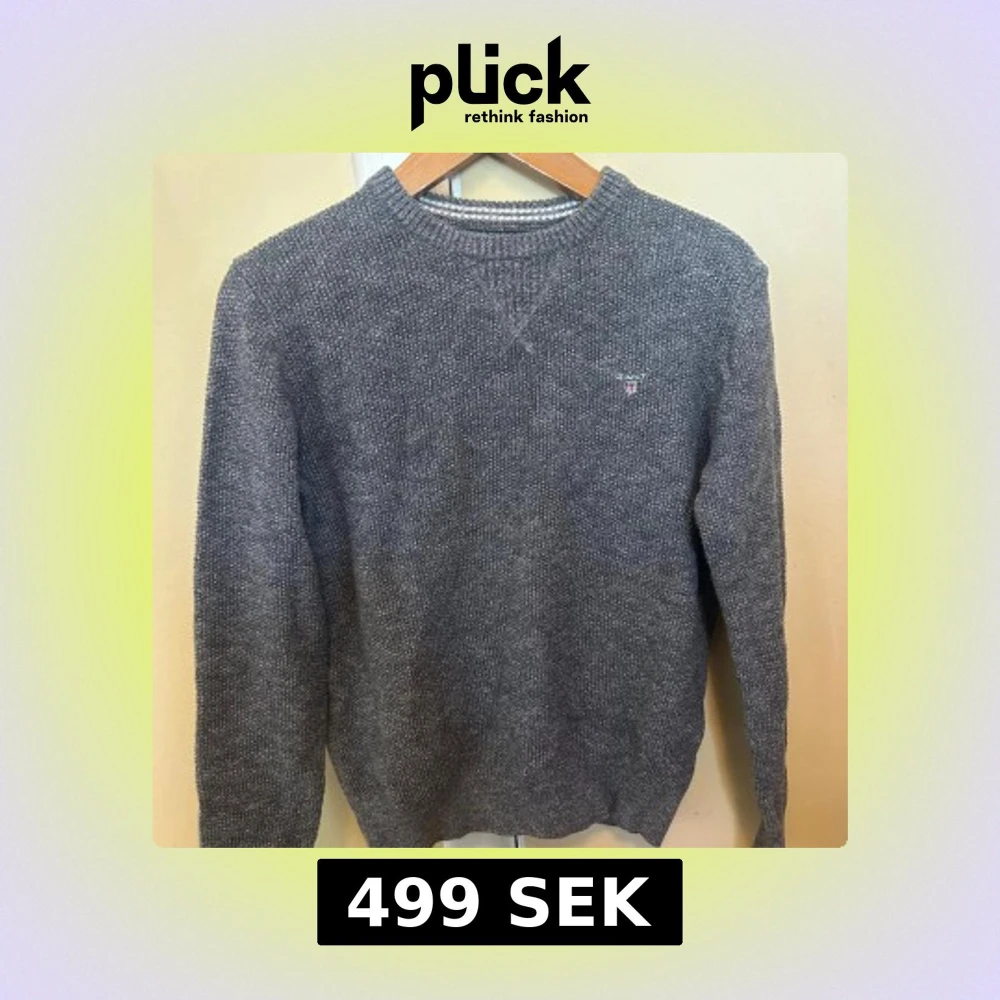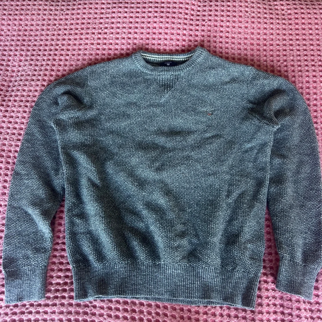 Mysig grå stickad tröja från Gant med rund halsringning och diskret broderad logga på bröstet. Tröjan har ribbade muddar vid ärmslut och nederkant, perfekt för lager-på-lager under kyliga dagar.kondition 10/10. Ribbad.