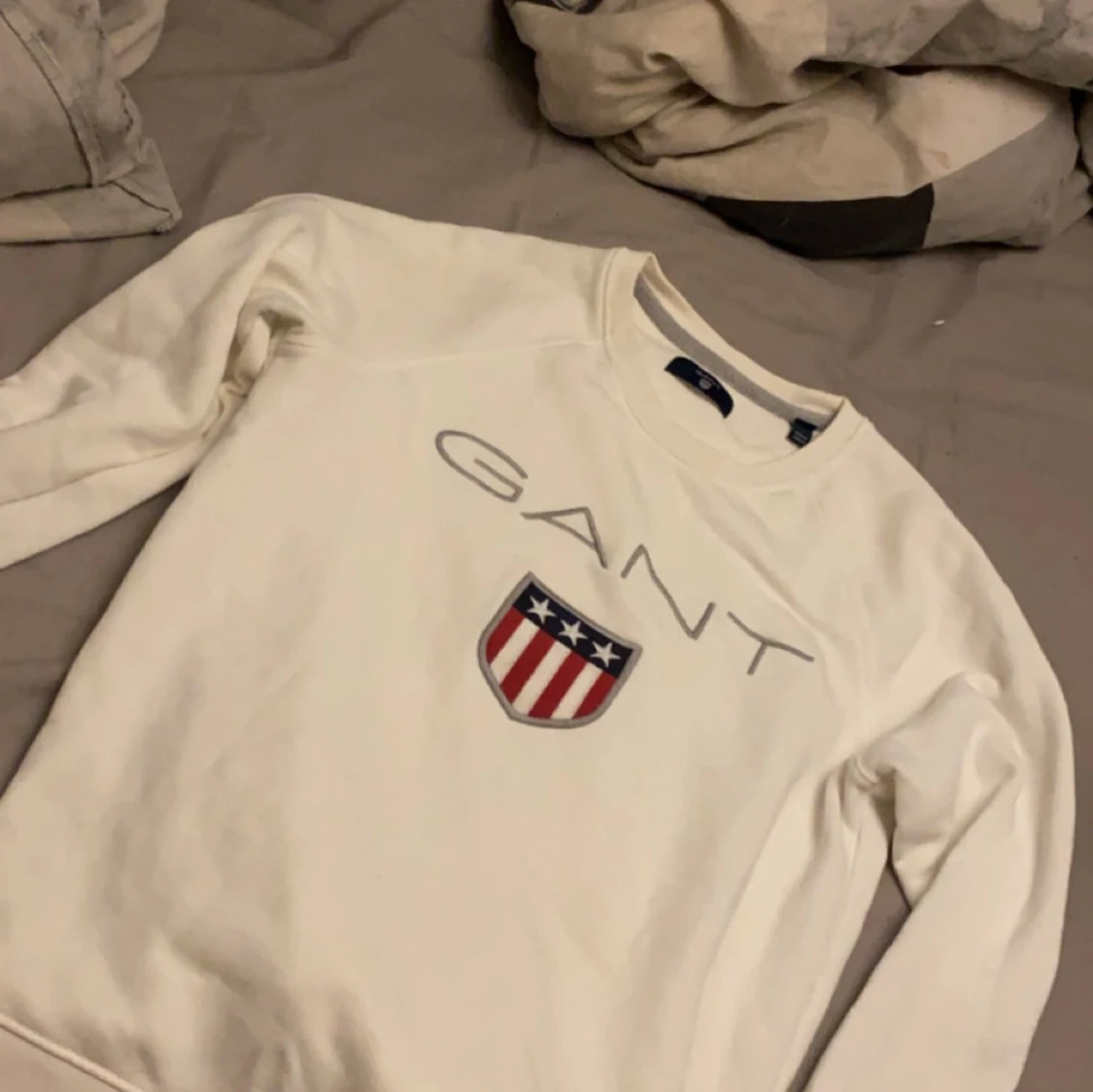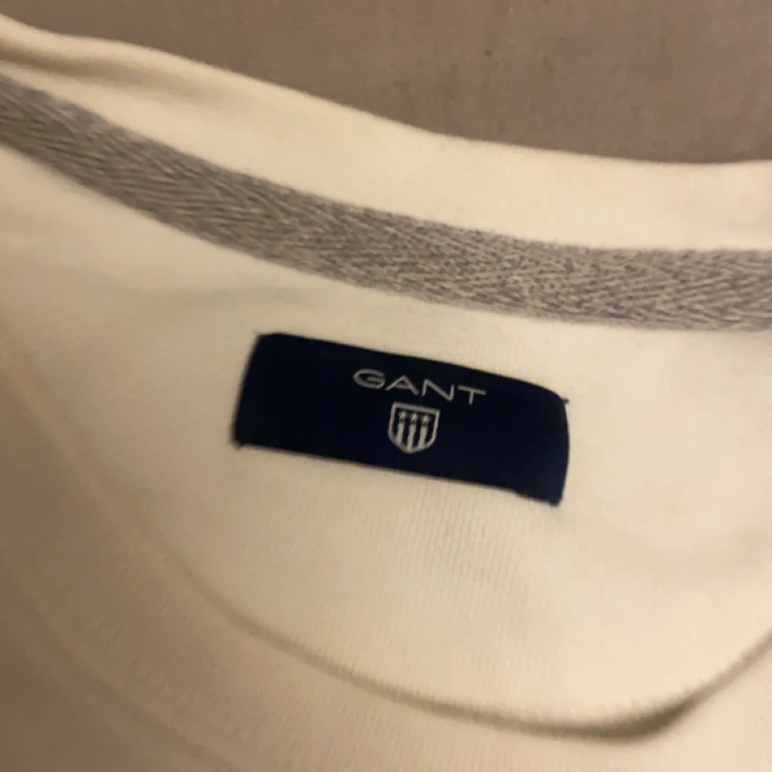 Säljer en snygg vit tröja från GANT med deras ikoniska logga och sköld på bröstet. Tröjan är i mycket bra skick och har långa ärmar. Perfekt för en stilren och avslappnad look. Passar både till vardags och lite finare tillfällen.
