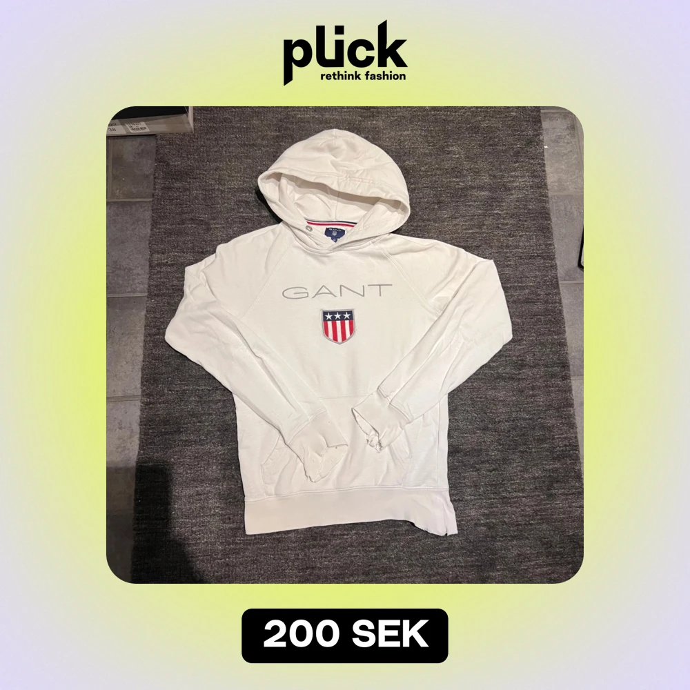 Säljer en vit hoodie från GANT med deras klassiska logga och ett coolt emblem på bröstet. Den har en skön luva och är perfekt för en avslappnad stil. Tyvärr är ärmsluten lite slitna, men annars i bra skick. Perfekt för höst och vår!