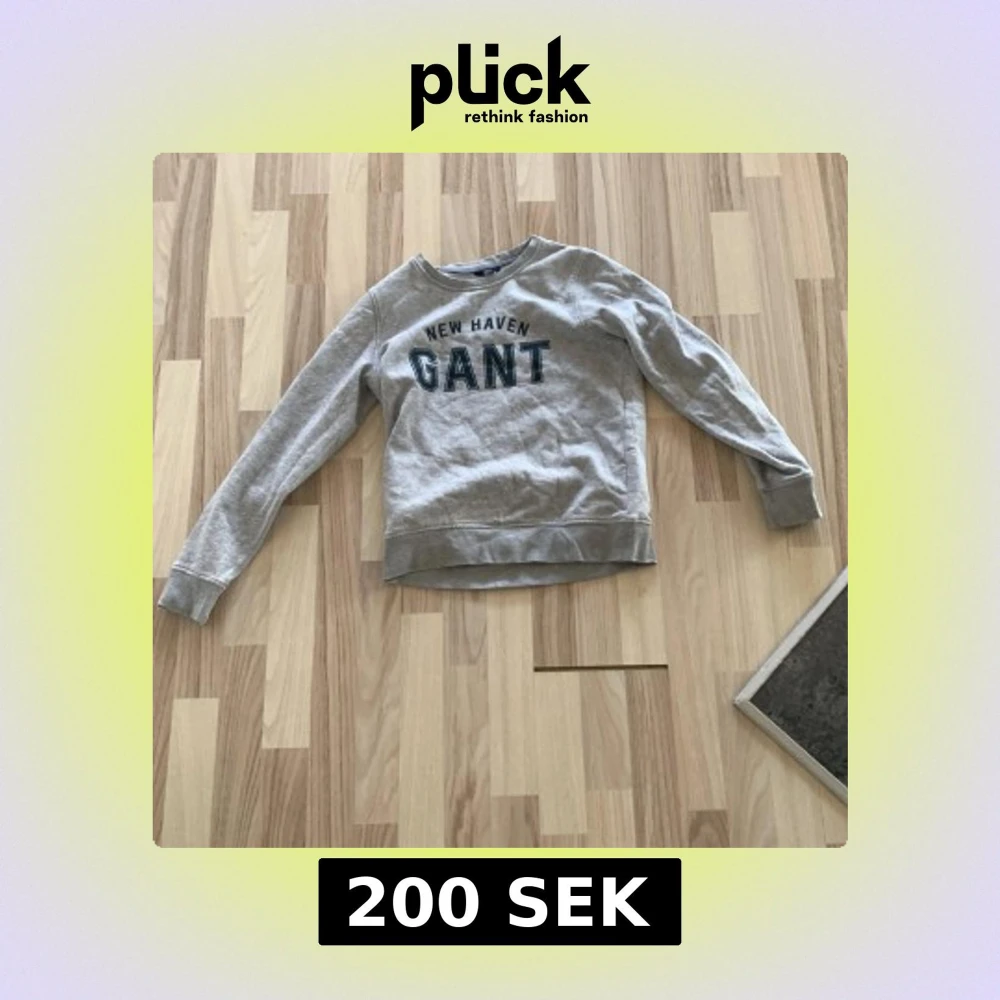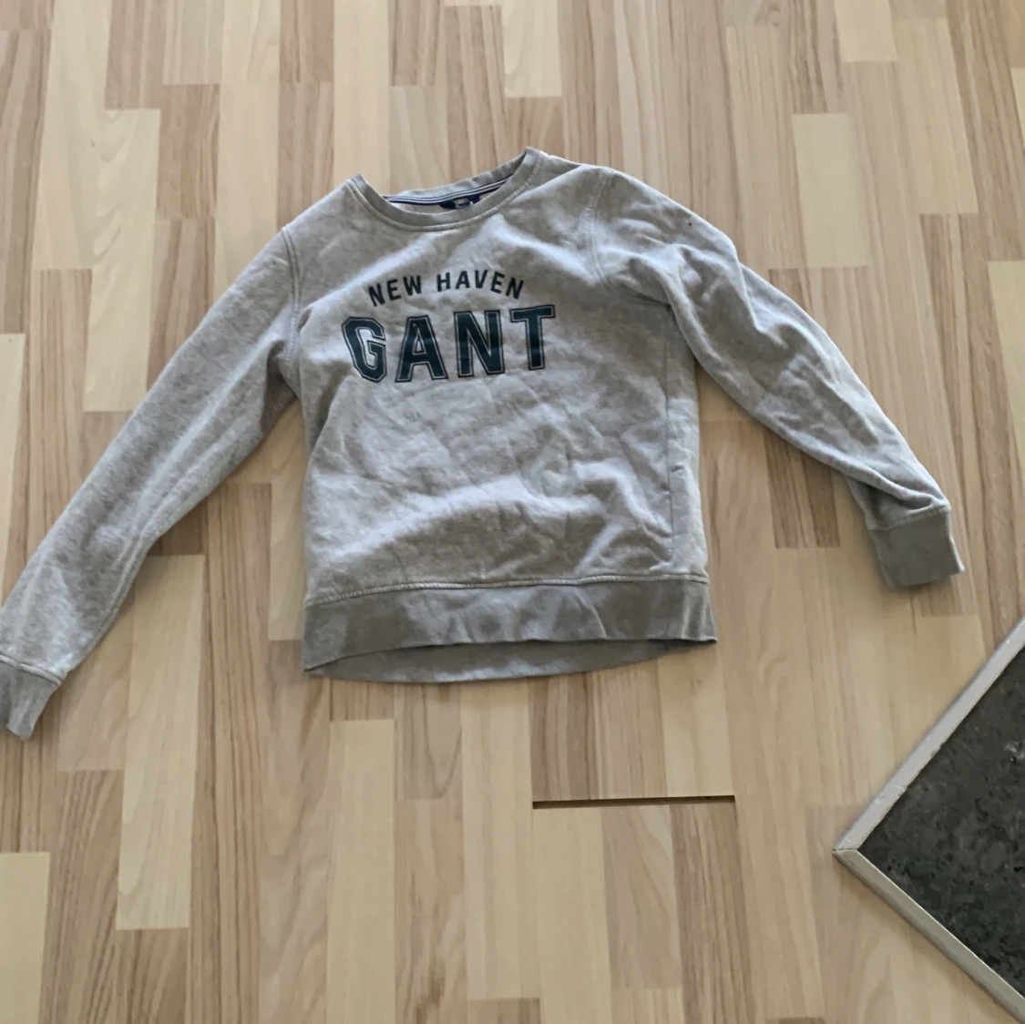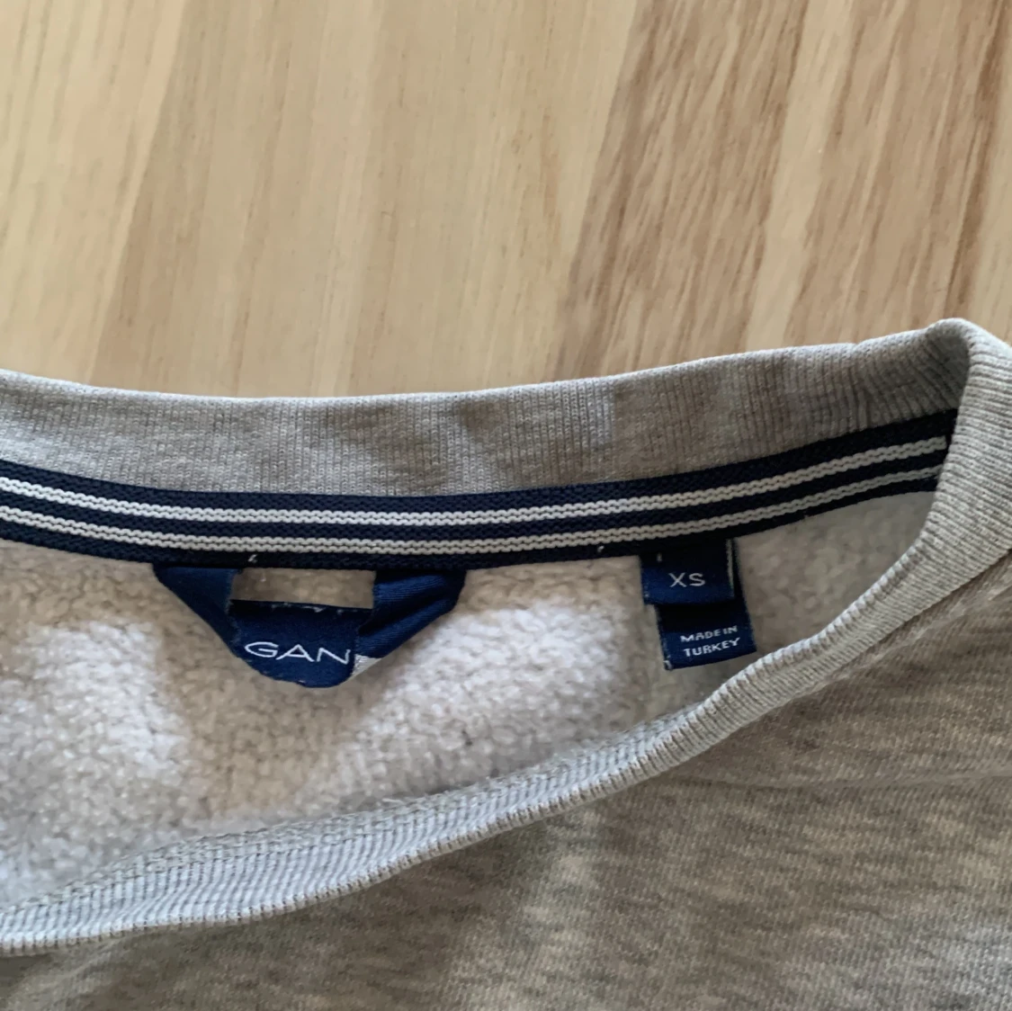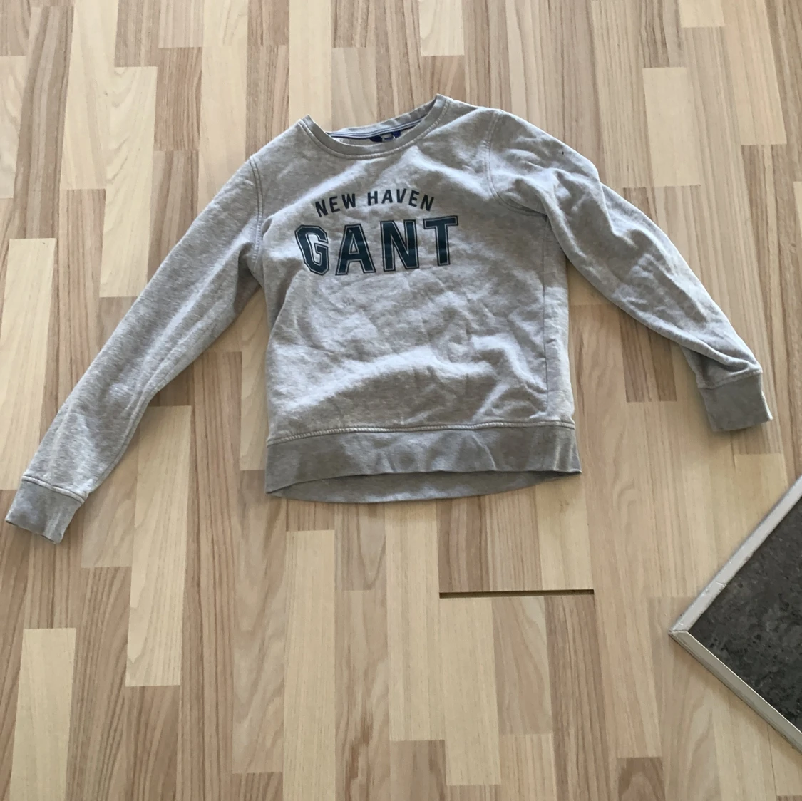 Snygg grå sweatshirt från GANT i storlek XS med trycket 'NEW HAVEN GANT' på bröstet. Tröjan har rund hals, långa ärmar och ribbade muddar. Perfekt för en chill och sportig look. Mjuk insida i bomullsmix.