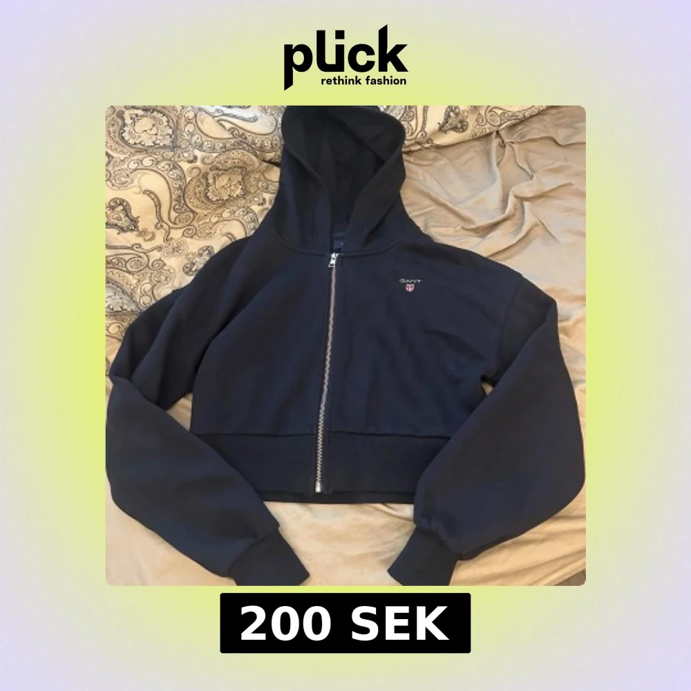 Säljer en marinblå croppad hoodie från Gant med dragkedja framtill och liten logga på bröstet. Tröjan har långa ärmar och en stor huva. Perfekt för en avslappnad och trendig stil. Storlek 170 men funkar som xs/s