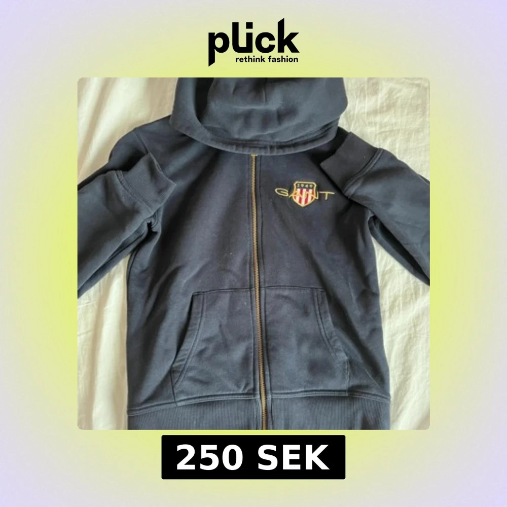 Säljer en mörkblå hoodie från GANT med dragkedja och broderad logga på bröstet. Har en liten fläck som inget går bort men inget man tänker på. I barnstorlek men motsvarar ungefär XXS