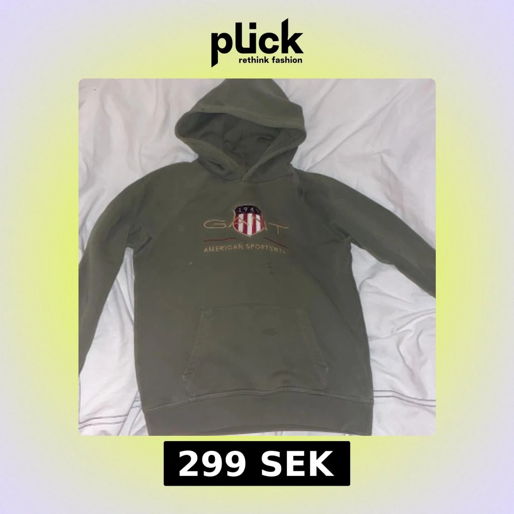 Säljer en grön hoodie från GANT med en stor ficka framtill och broderad logga på bröstet. Perfekt för en avslappnad stil. Huvan ger extra mysfaktor.