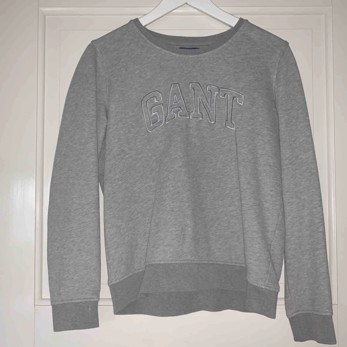 Grå sweatshirt från GANT som är väldigt skön men sällan använd. Stort tryck på framsidan, inga överisa detaljer. Fler bilder kan skickas, frakt ingår ej.