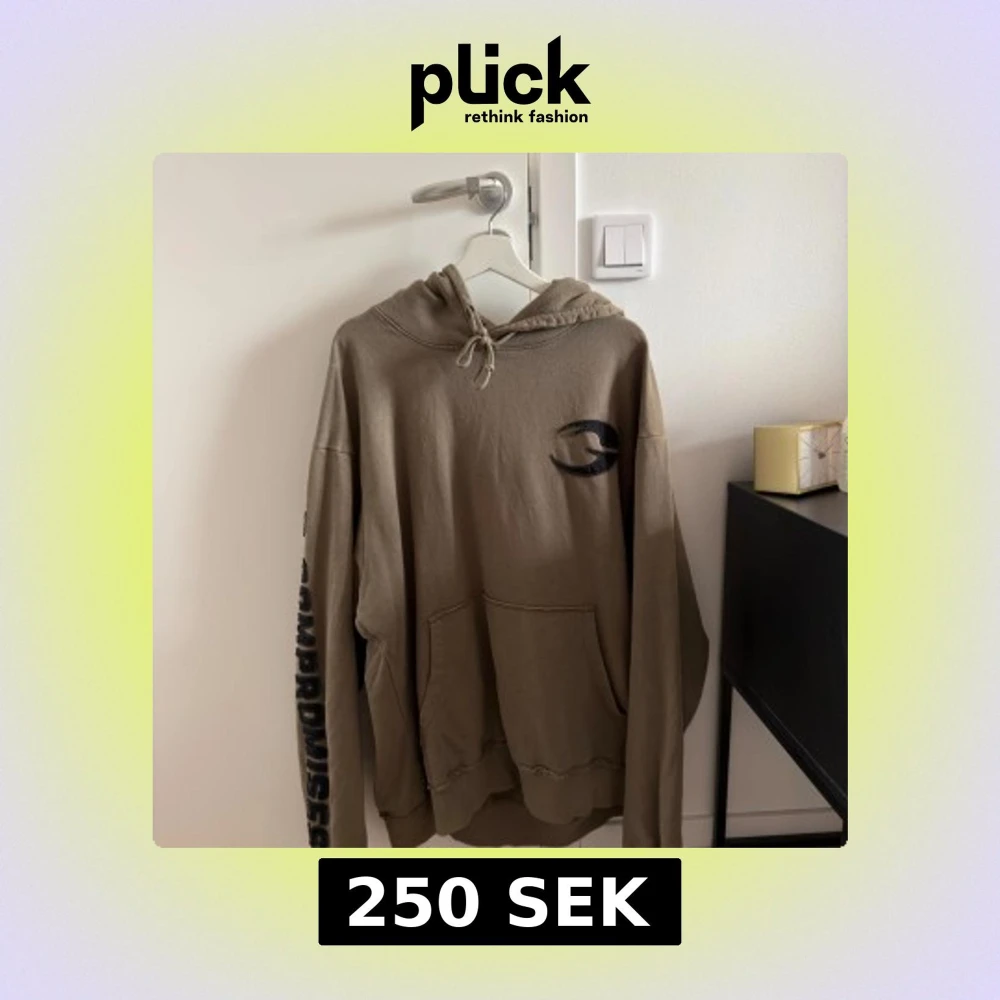 Säljer en beige hoodie med svart tryck på bröstet och text längs ena ärmen. Tröjan har huva med snörning och en stor magficka framtill. Perfekt för en avslappnad och cool stil.
