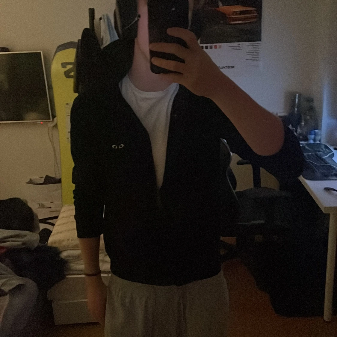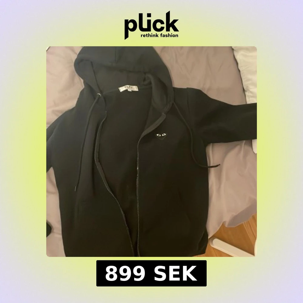 Svart hoodie från Comme des Garçons Play med dragkedja och huva. Ikoniskt hjärta med ögon på bröstet och stort hjärta med ögon på. S/M