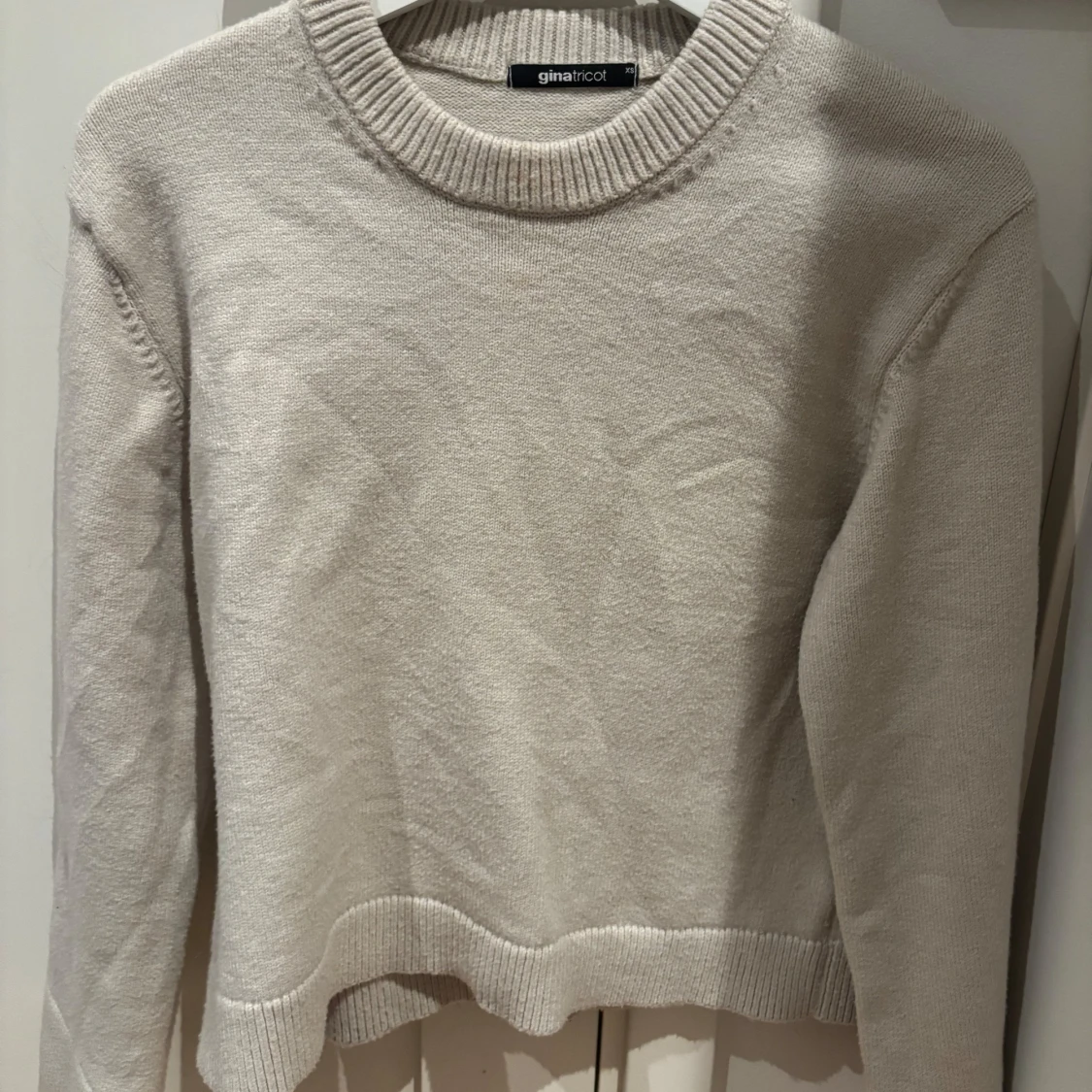 Supermjuk beige stickad tröja från Gina Tricot i storlek XS. Tröjan har rund halsringning, ribbade muddar och en klassisk, enkel design som är lätt att matcha. Perfekt för lager-på-lager och chill dagar.