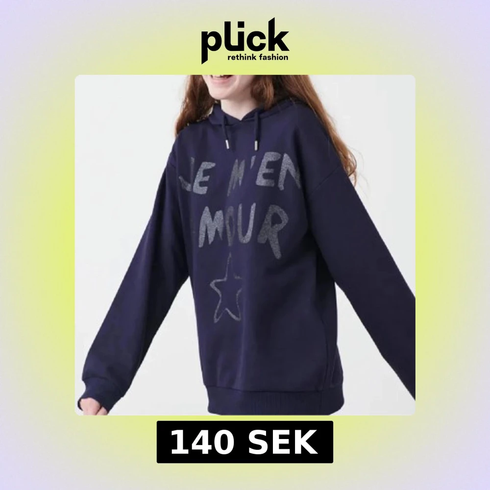 Säljer en mörkblå hoodie med text i glittrigt tryck på framsidan. Hoodien har en stjärndetalj och justerbar dragsko i huvan. Skriv för fler bilder. Pris är diskuterbart💗