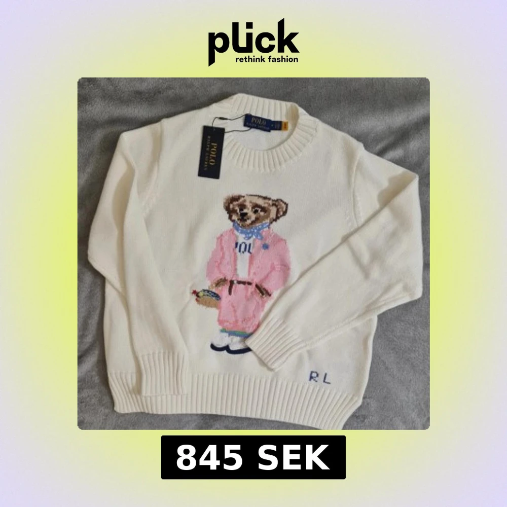 Vit stickad tröja från Ralph L med ikonisk björn på bröstet, klädd i rosa kappa och blå scarf. Tröjan har rund halsringning, ribbade muddar och RL-broderi nertill. Perfekt statement-piece för dig som gillar preppy stil. Unisex storlek S