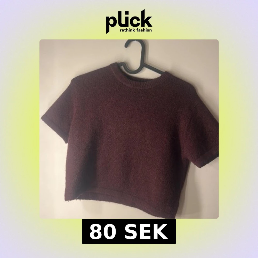 Säljer en croppad stickad tröja i mörklila färg. Tröjan har korta ärmar och rund halsringning, perfekt för lager-på-lager eller till höstens outfits. Använd en gång.