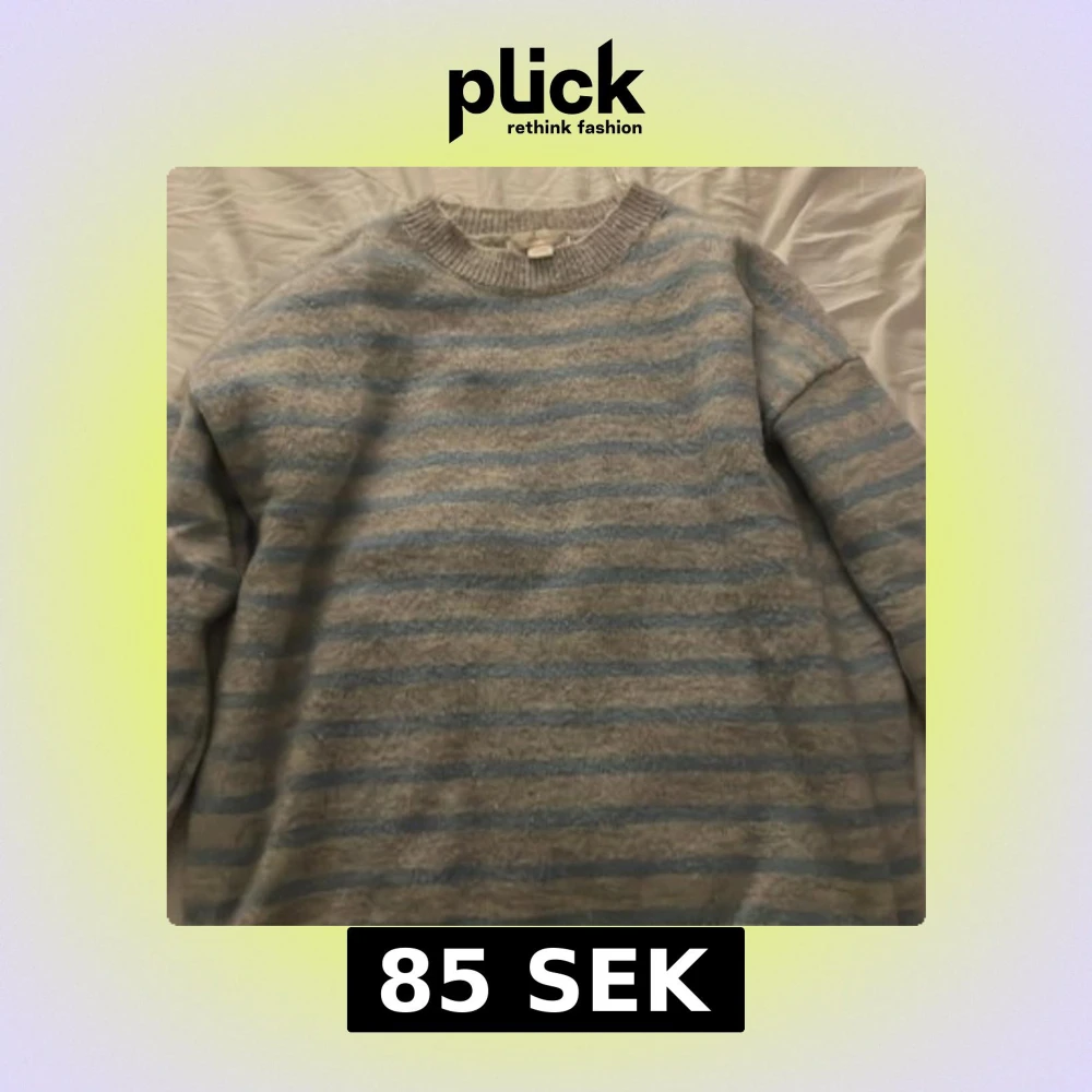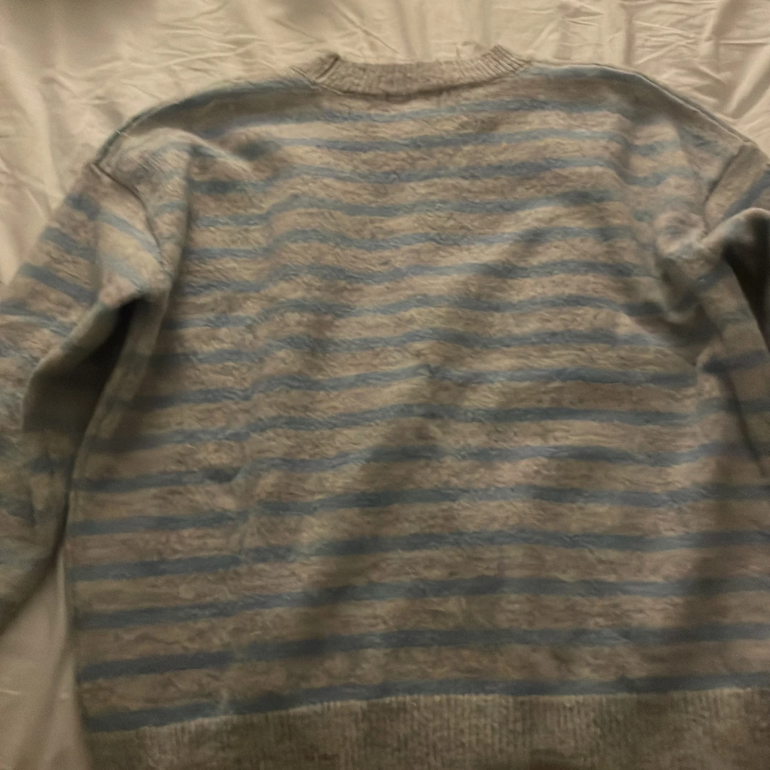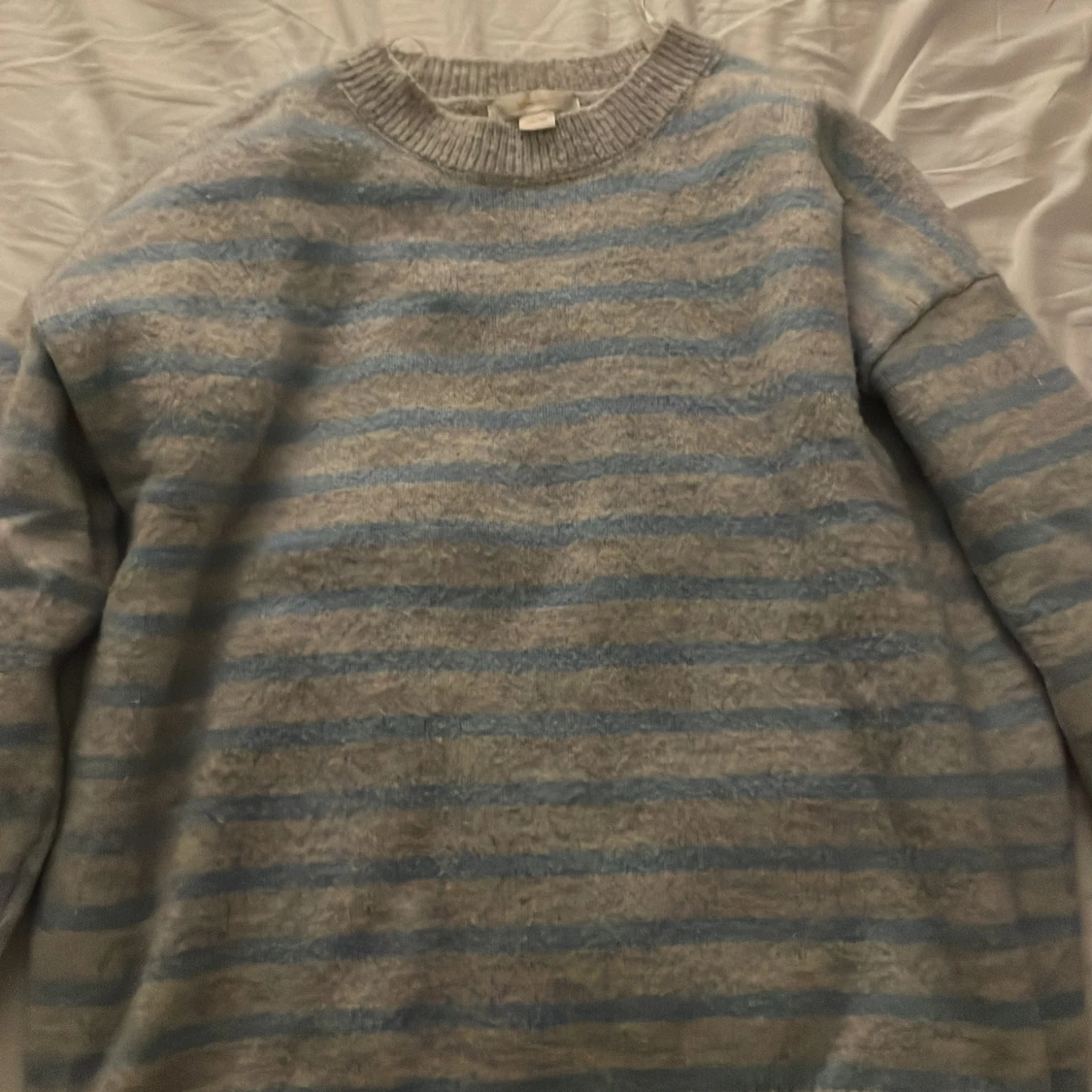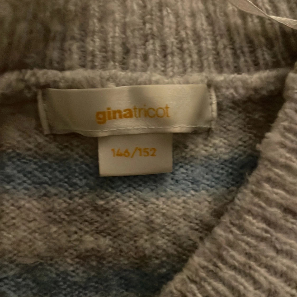Mysig stickad tröja från Gina Tricot i storlek 146/152. Tröjan har ett randigt mönster i ljusblått och grått, rund halsringning och långa ärmar. Perfekt för dig som gillar en chill och stilren look.