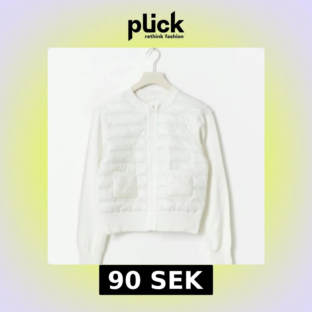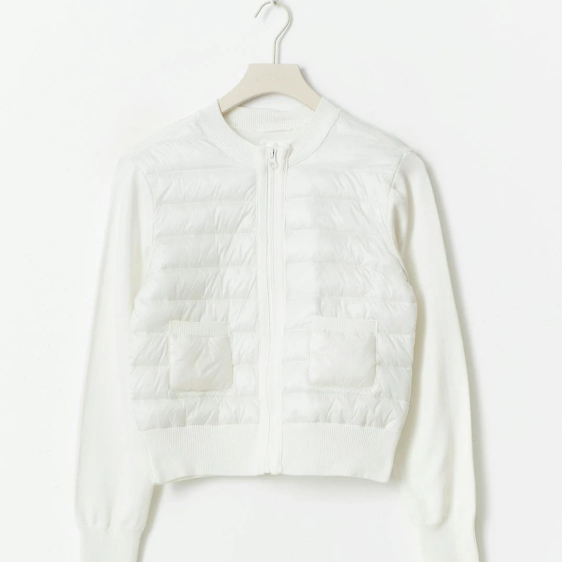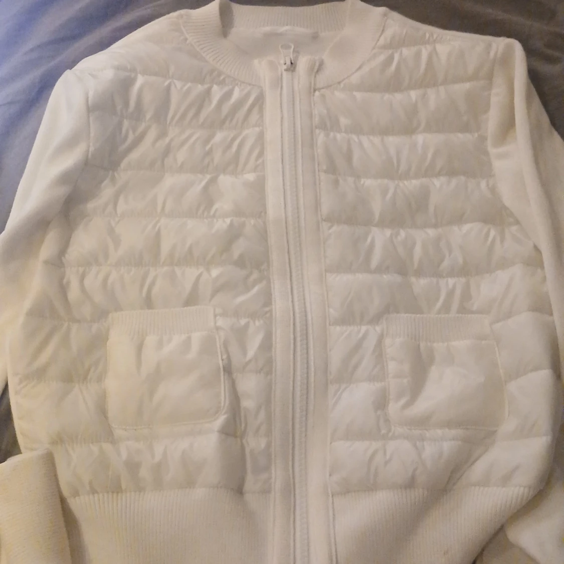Säljer en vit quiltad kofta med dragkedja framtill och två fickor. Tröjan har ribbade muddar, lång ärm och en croppad passform. Framsidan är vadderad och ger en snygg kontrast till de stickade ärmarna och ryggen. Perfekt för lager-på-lager-stil.
