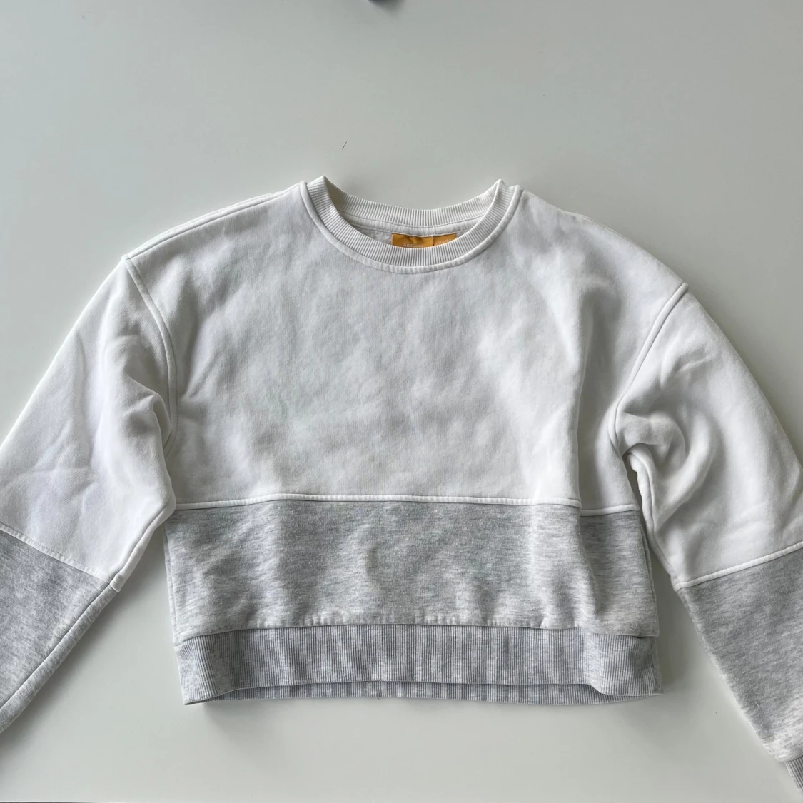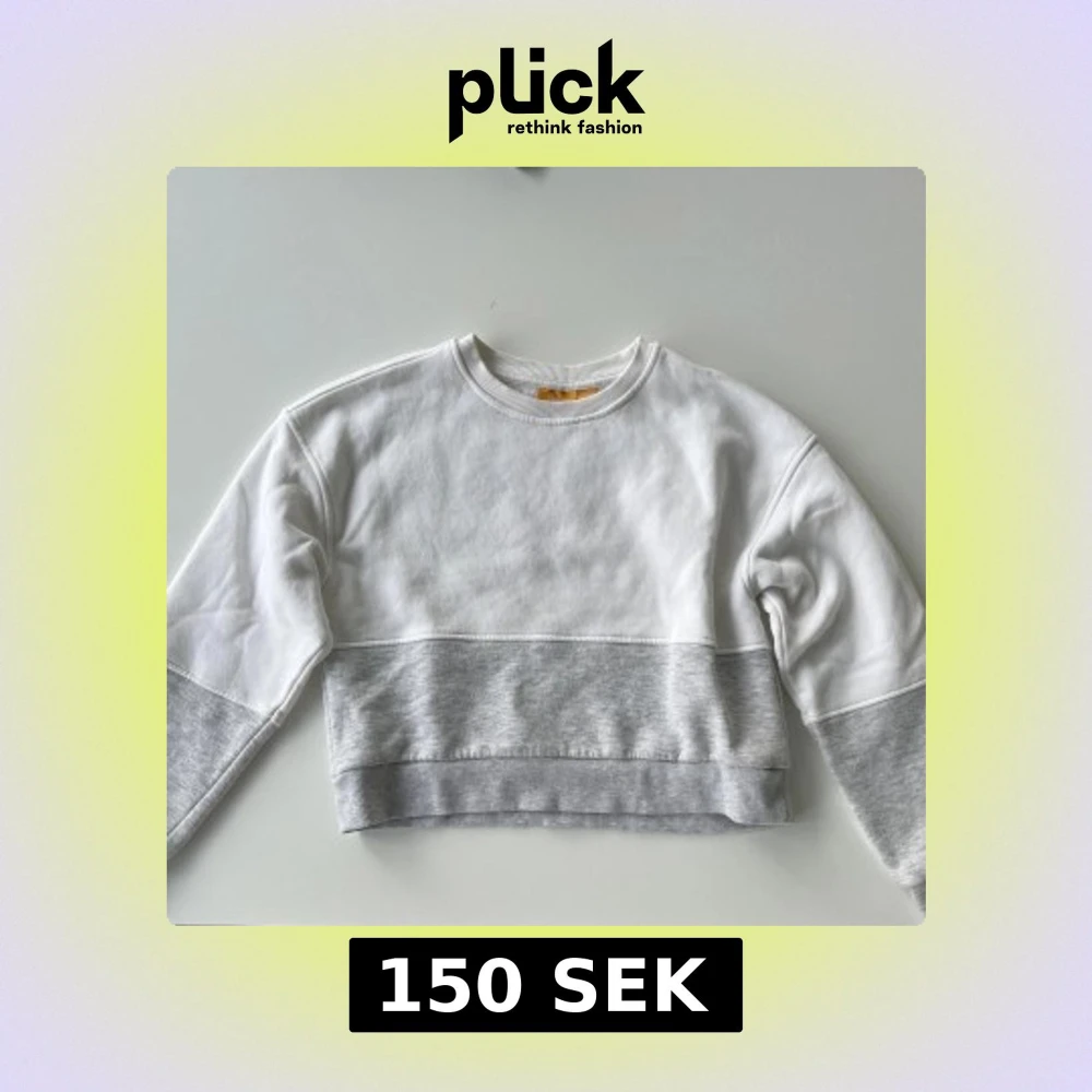 Snygg croppad sweatshirt i vitt och ljusgrått från Gina tricot. Den är i fint skick, använd fåtal gånger. Storlek 146/152 men passar XXS.