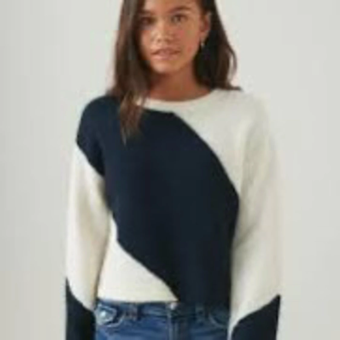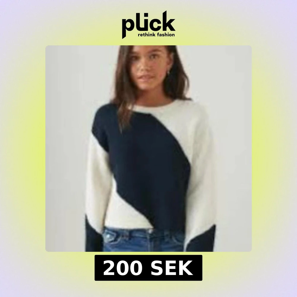 Snygg stickad tröja med coolt diagonalt mönster i marinblått och vitt. Tröjan har rund halsringning och långa ärmar. Perfekt att matcha med jeans för en chill look.