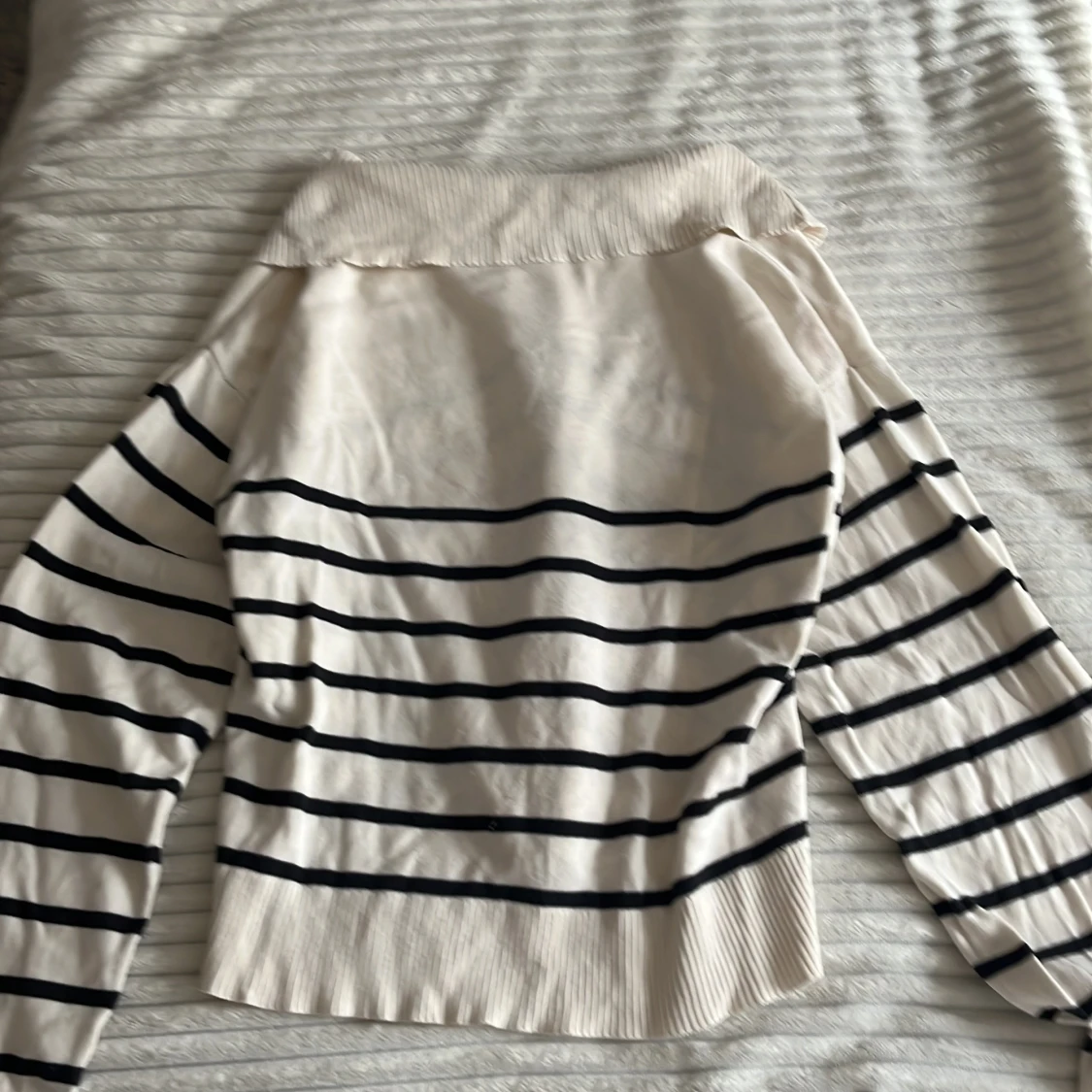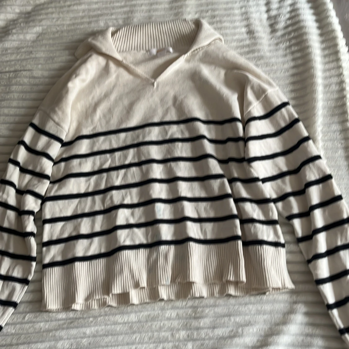 Säljer en randig tröja från Gina Young. Den är randig och har en ribbad krage. Den är i Storlek 158-164 men passar mig som brukar ha XS/S. Den är i bra skick men den gick sönder vid kragen så jag har sytt ihop där men det märks inte på långt håll. 💖💖💖