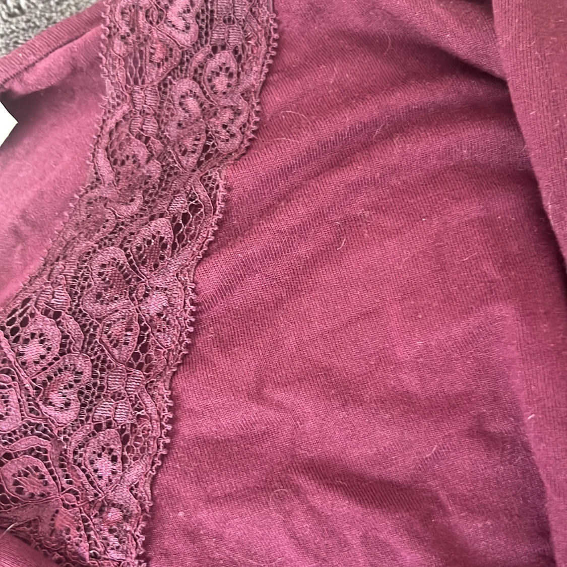 Vinröd långärmad topp från Gina Tricot med snygg v-ringning och spetsdetaljer framtill. Mjuk och skön i bomullsmaterial, perfekt för dig som gillar en enkel men ändå feminin stil. Passar till både jeans och kjol.