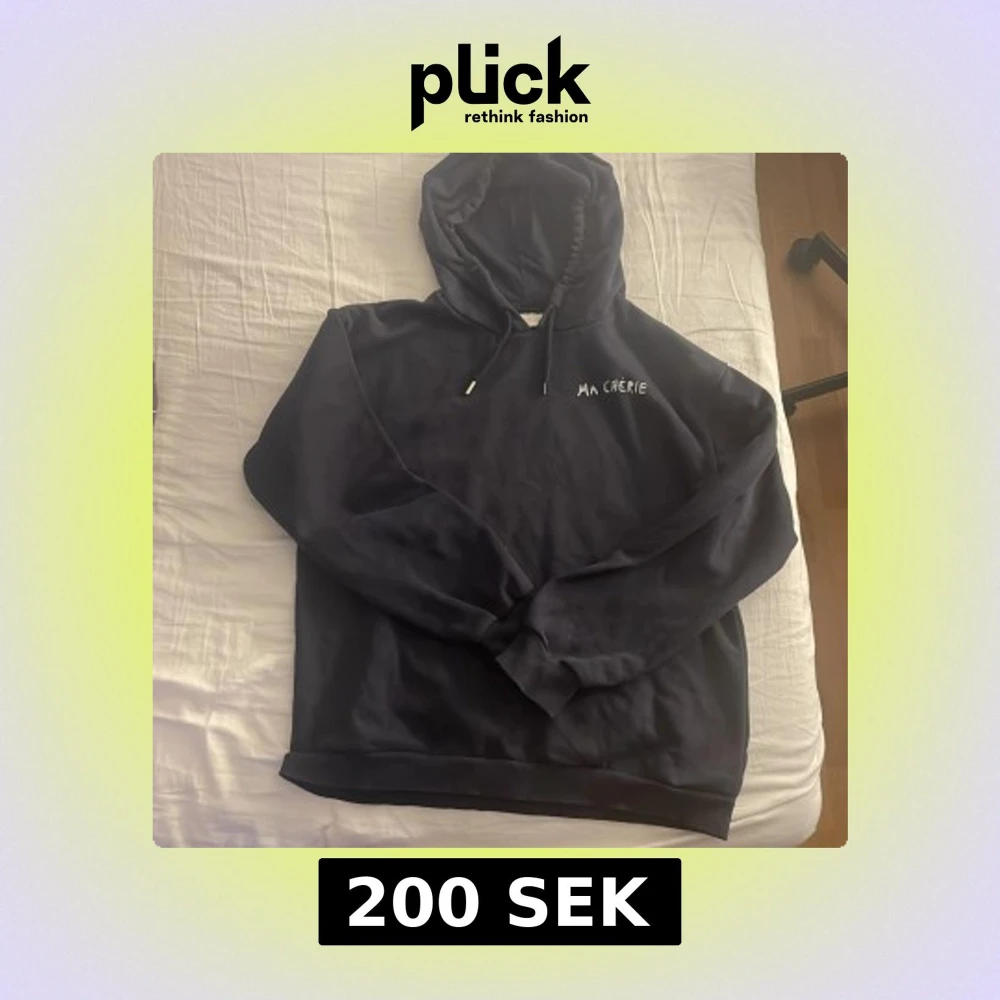 Säljer en mörk blå hoodie med texten 'Ma Chérie' och två hjärtan i vitt tryck på ryggen. Hoodien har huva med dragsko och ribbade muddar. Perfekt för en avslappnad stil.