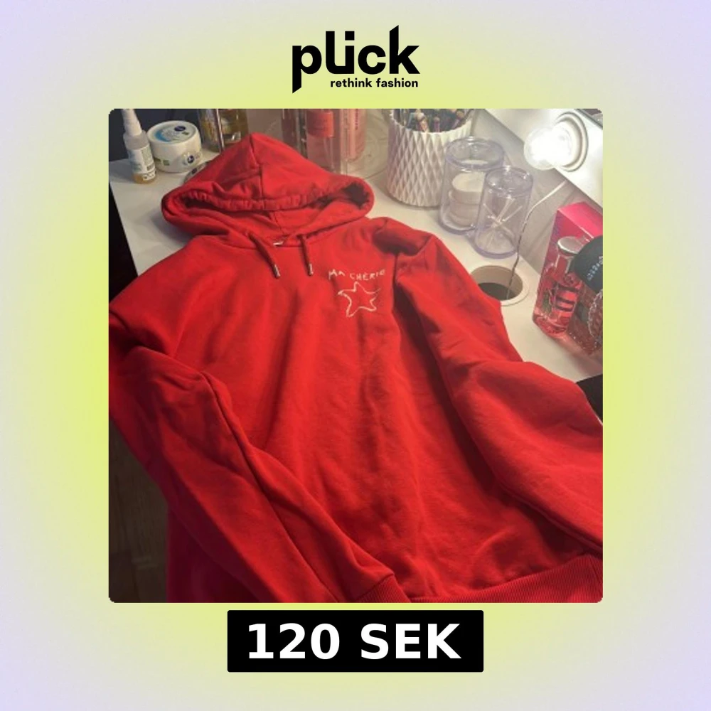 Röd hoodie från Gina Tricot med vit text 'Ma Chérie' och en stjärna tryckt på bröstet. Tröjan har huva med snörning, långa ärmar och ribbade muddar. Perfekt för dig som gillar en chill och snygg stil. Storlek 158-164 men passar lika bra på någon som har xxs/xs💞