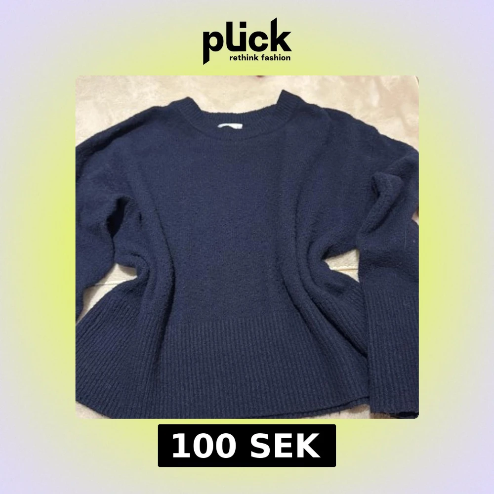 Mysig mörkblå stickad tröja från Gina Tricot med rund halsringning och ribbade muddar vid ärmslut och nederkant. Perfekt för kyliga dagar och enkel att matcha med jeans eller kjol.
