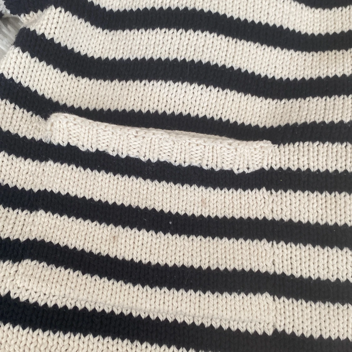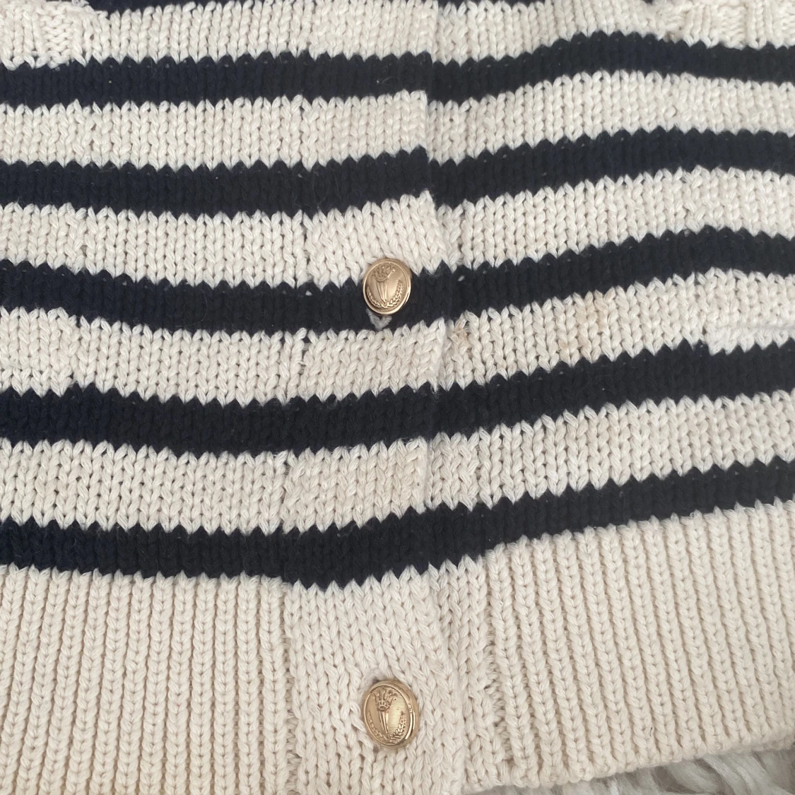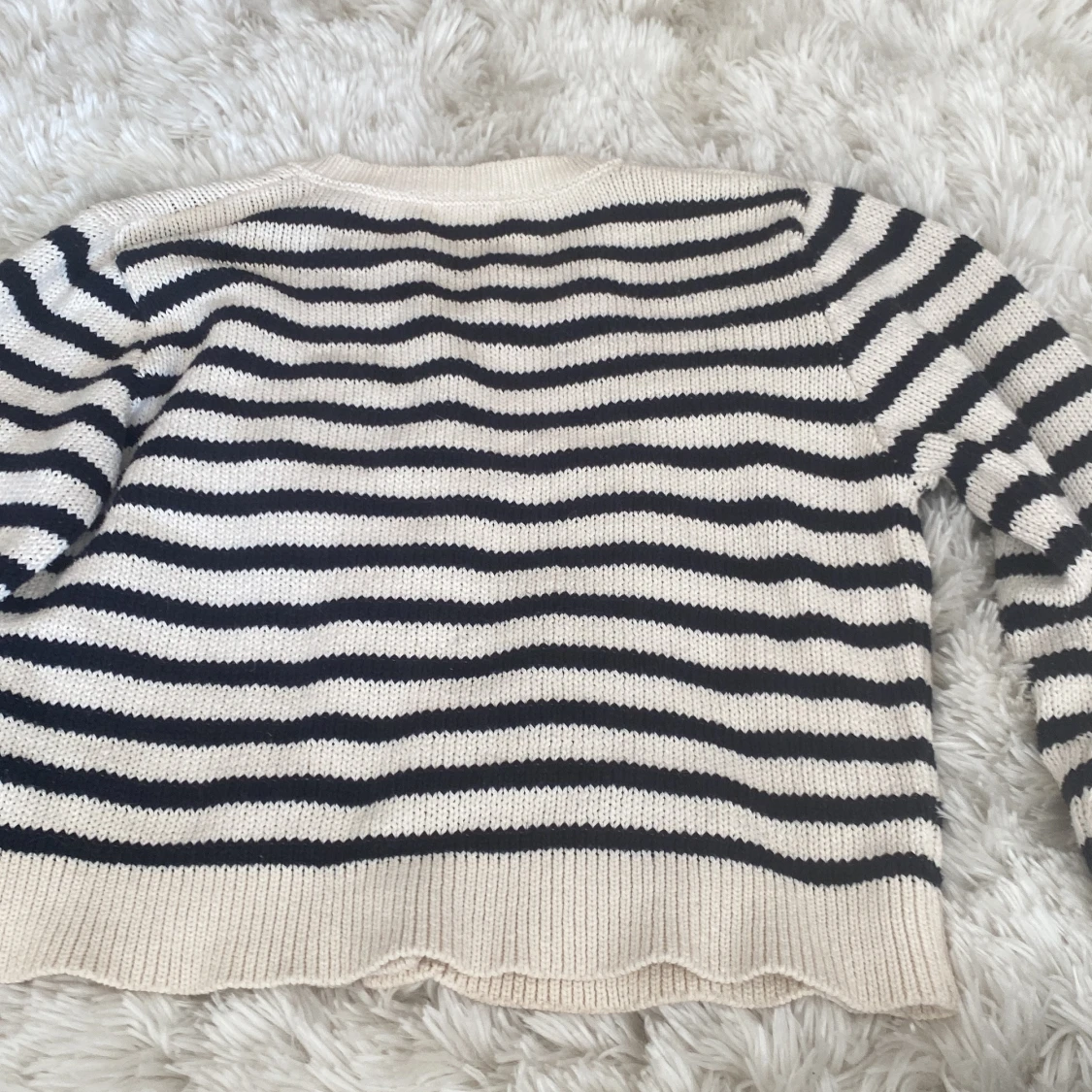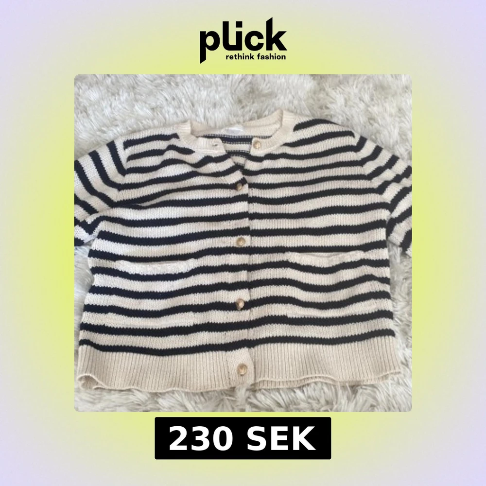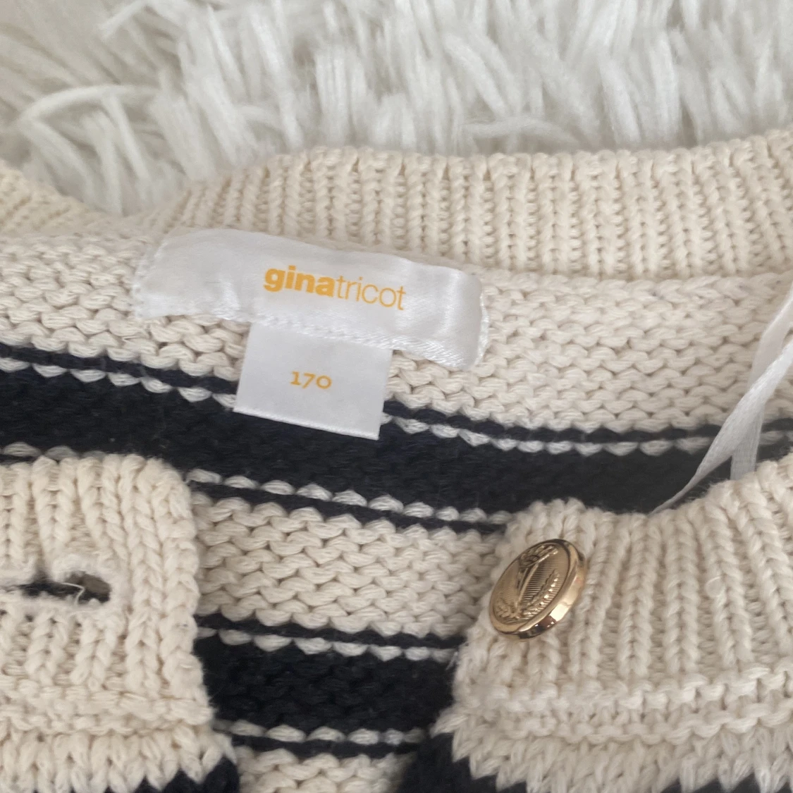 Säljer en snygg randig kofta från Gina Tricot i svart och beige. Koftan har långa ärmar och knappar framtill. Perfekt för en stilren look.⭐️