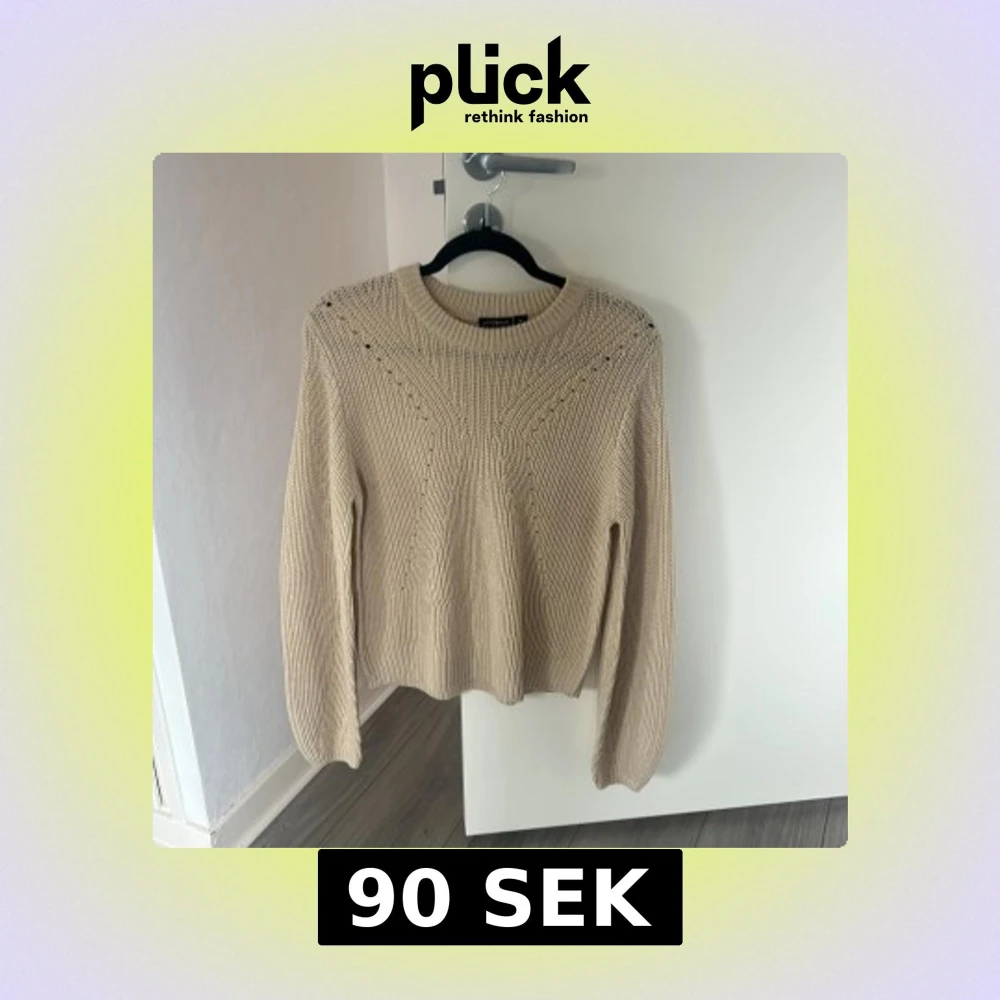 Säljer en beige stickad tröja med snyggt stickat mönster upptill. Tröjan har rund halsringning och långa ärmar, perfekt för kyliga dagar. Enkel att matcha med jeans eller kjol.