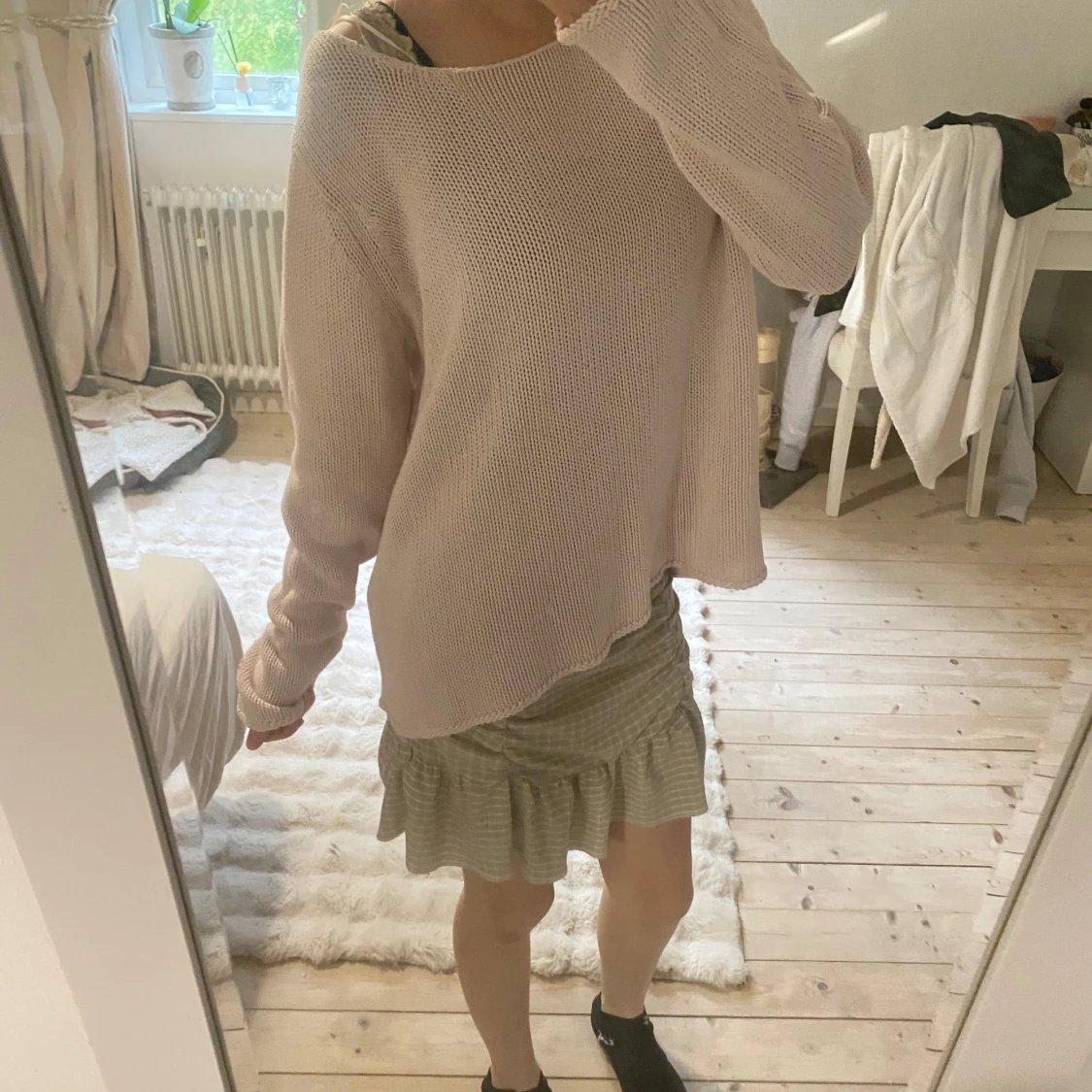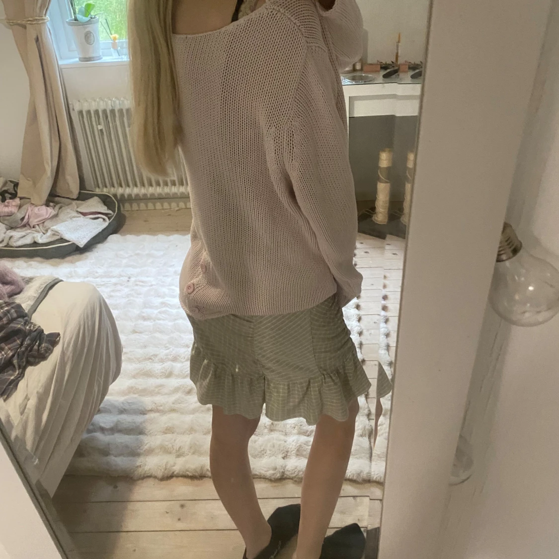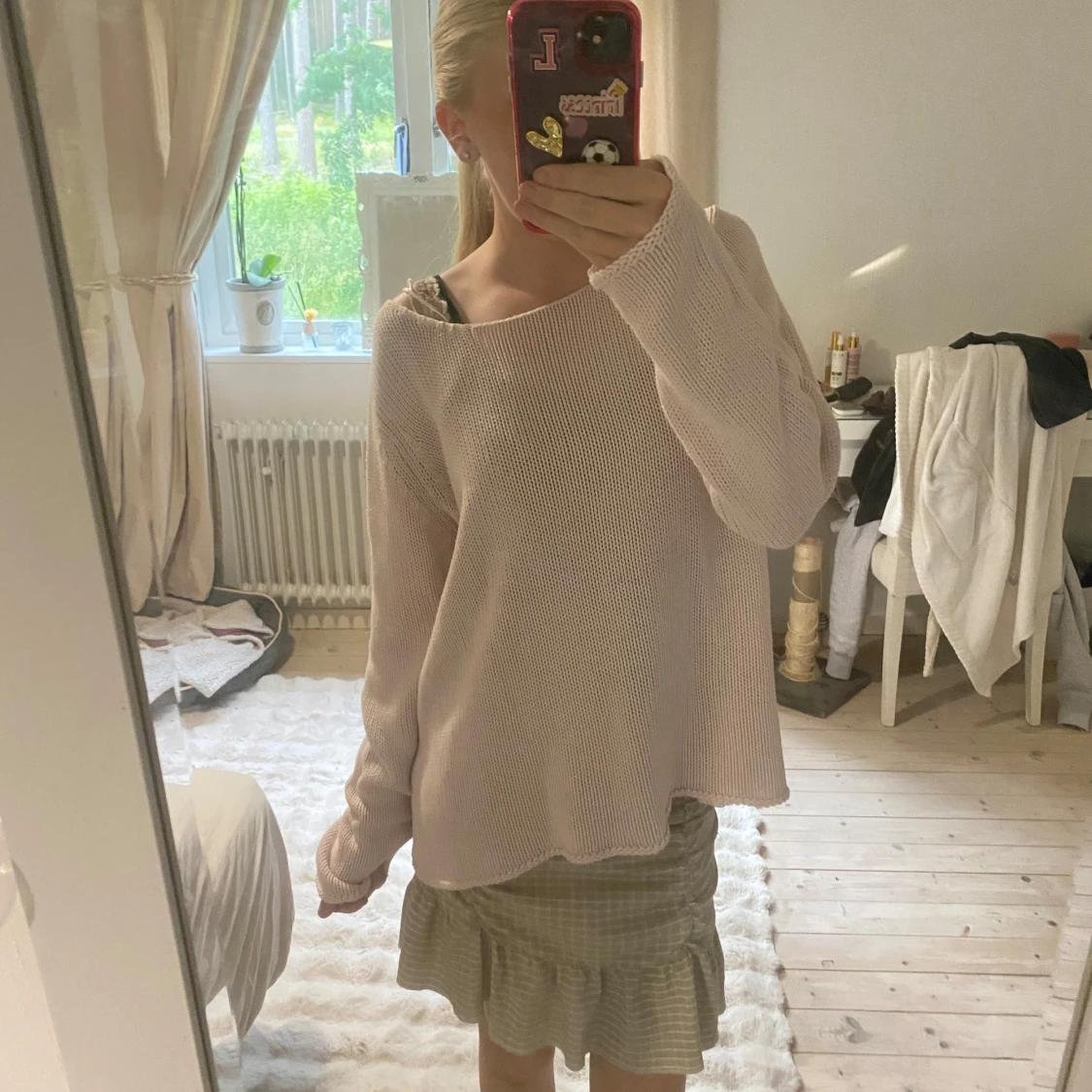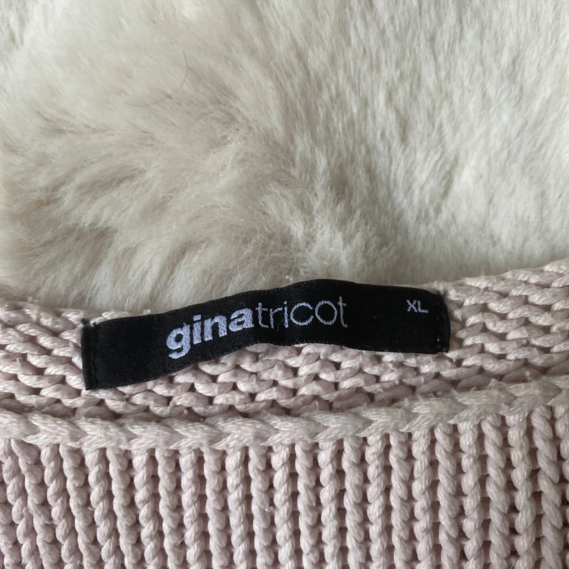 Säljer en ljusrosa stickad tröja från Gina Tricot. Tröjan har lång ärm, rund halsringning och tre dekorativa knappar bak. Perfekt för lager-på-lager och enkel att matcha med olika outfits.