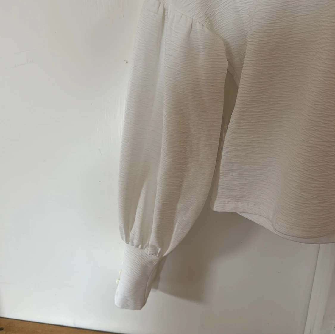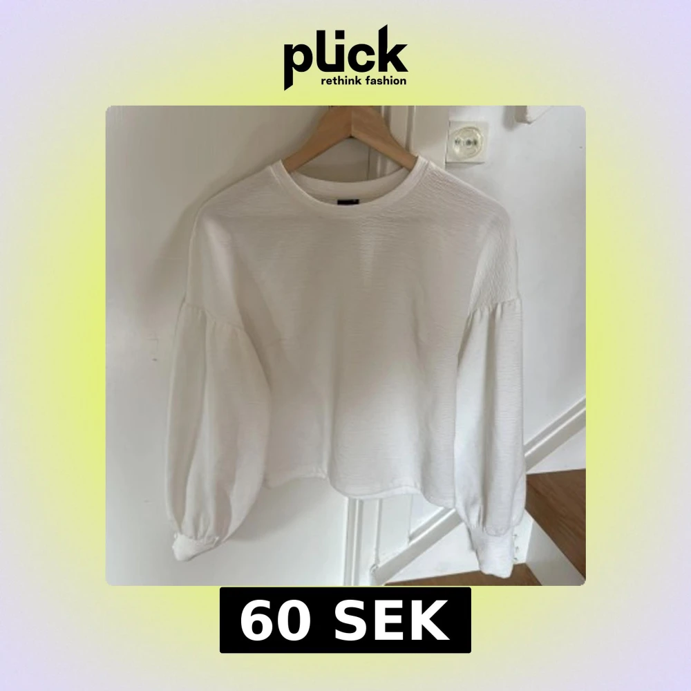Säljer en vit långärmad topp från Gina Tricot i storlek XS. Tröjan har ballongärmar med knappar vid ärmslut och en lätt croppad passform. Perfekt till lager-på-lager eller som den är.