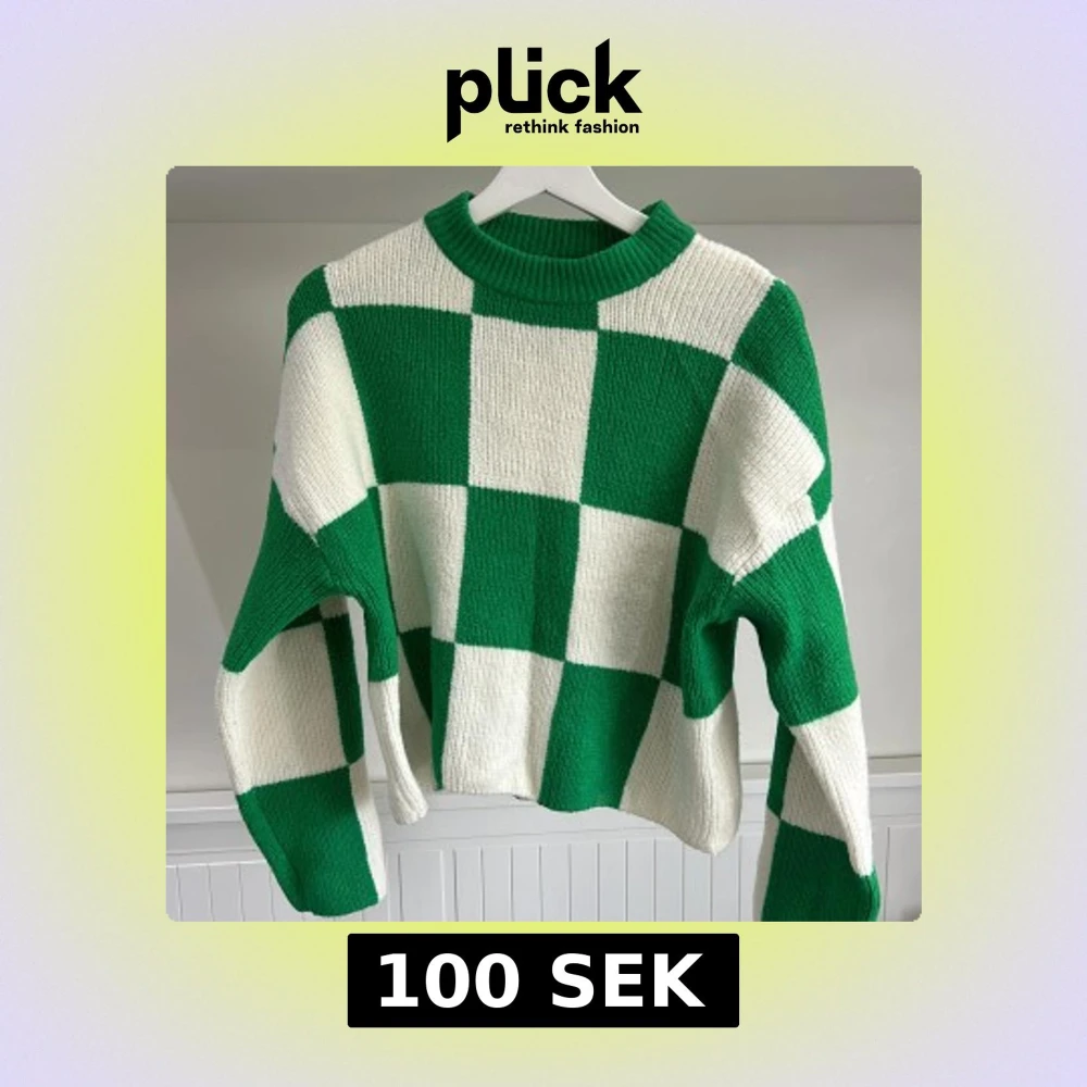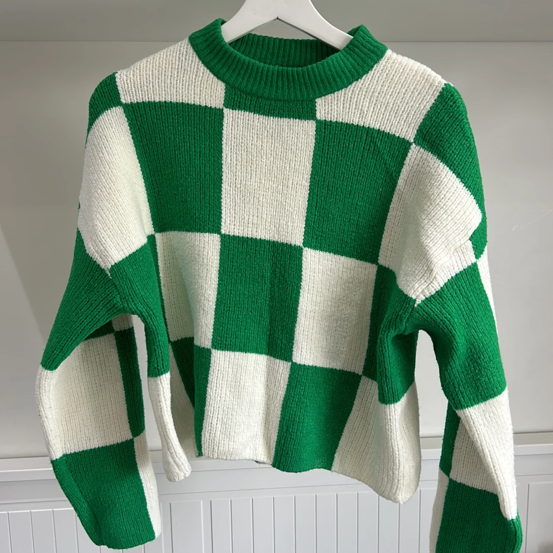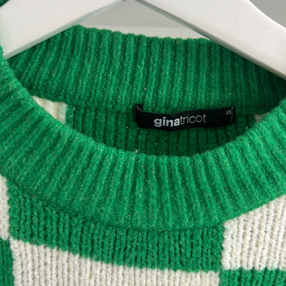 Säljer en stickad tröja från Gina Tricot i storlek XS. Tröjan har ett grönt och vitt rutigt mönster, rund halsringning och långa ärmar. Perfekt för dig som gillar färg och mönster!