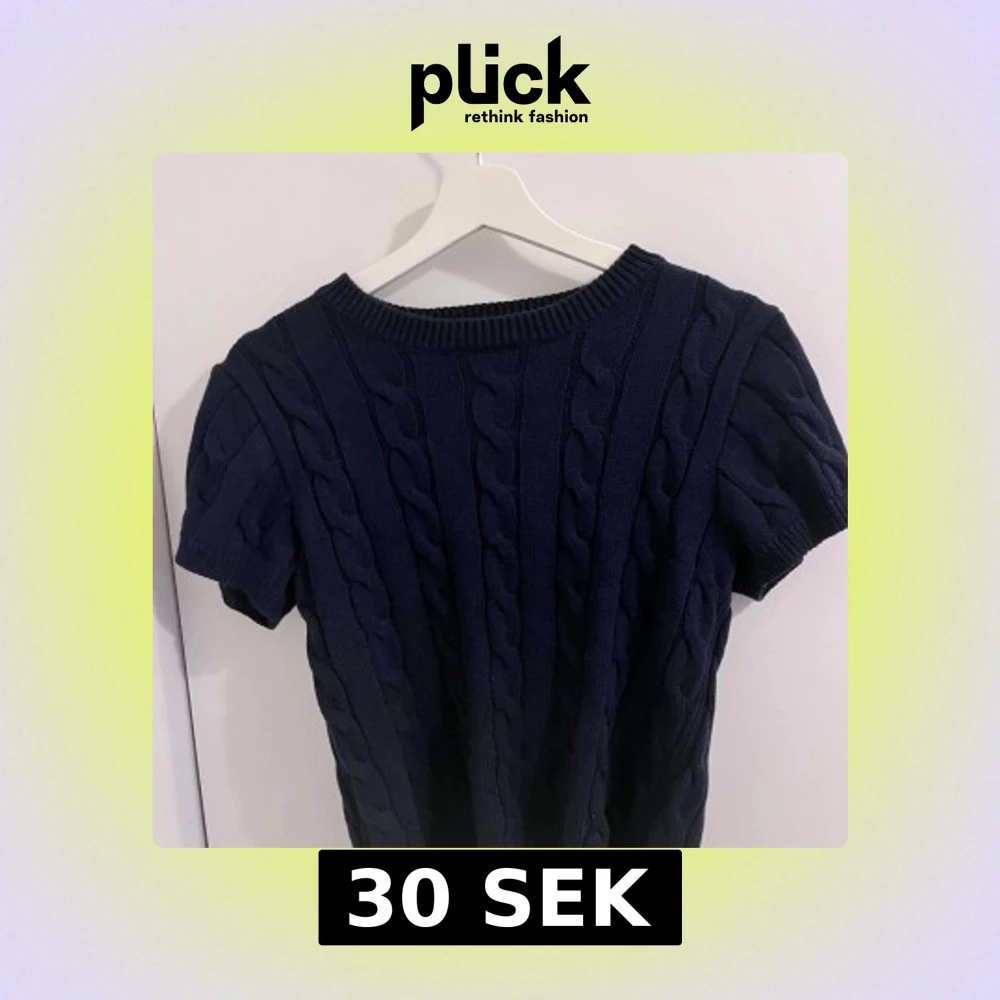 Snygg mörkblå stickad tröja från Gina Tricot med korta ärmar och grovt kabelstickat mönster. Rund halsringning med ribbad kant och mjukt material som känns skönt mot huden. Perfekt för dig som gillar klassisk stil med en modern twist. Aldrig använd, endast testad.