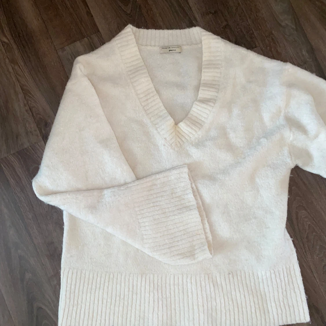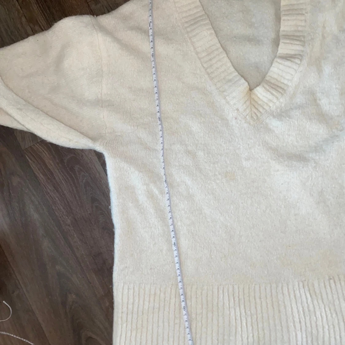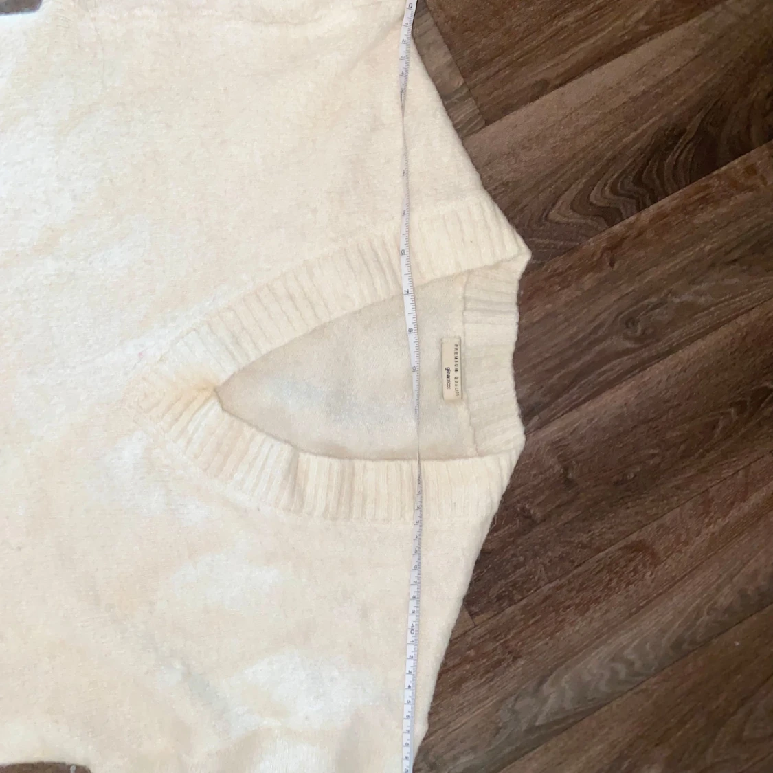 Mysig vit stickad tröja från Gina med bred ribbad kant vid ärmslut och nederkant. V-ringad hals och långärmad modell, perfekt för lager-på-lager. Mjuk och skön känsla, passar dig som gillar clean och enkel stil. Liiite nopprig men inget man lägger märke till.