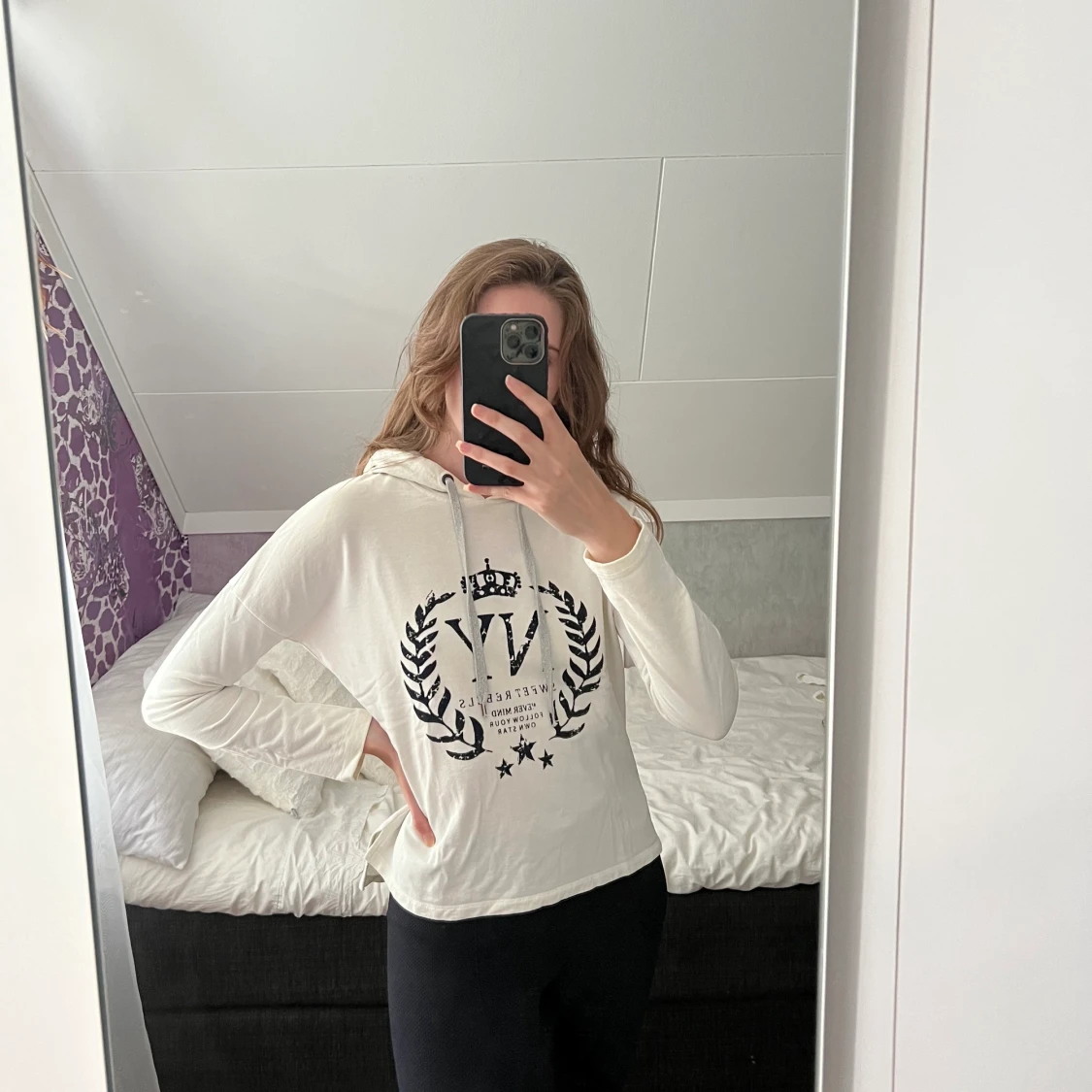 Passform: Normal. Detaljer: Luvtröja med marinblått tryck. Referens: Jag är 1,80 m, och tröjan är lite för liten för mig i min smak.