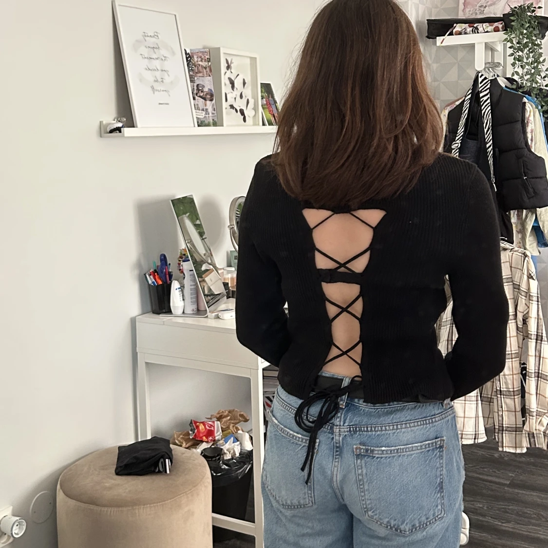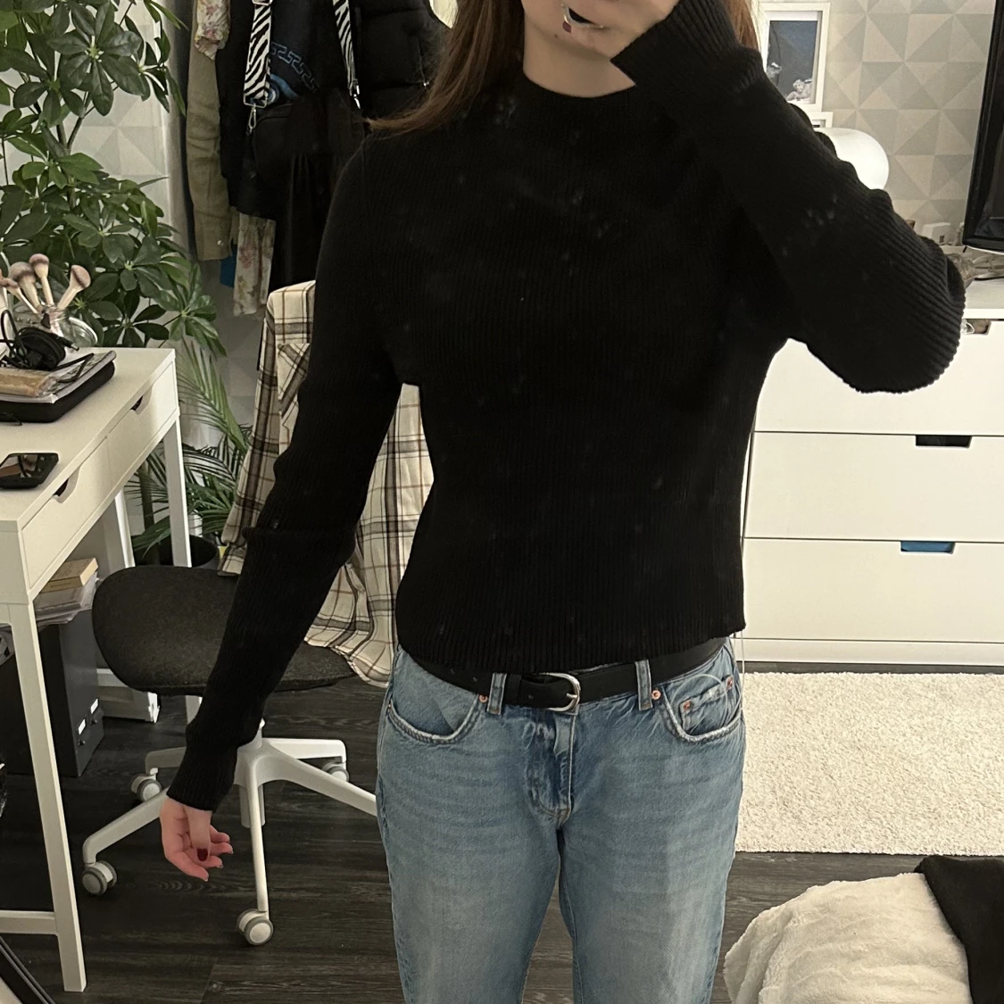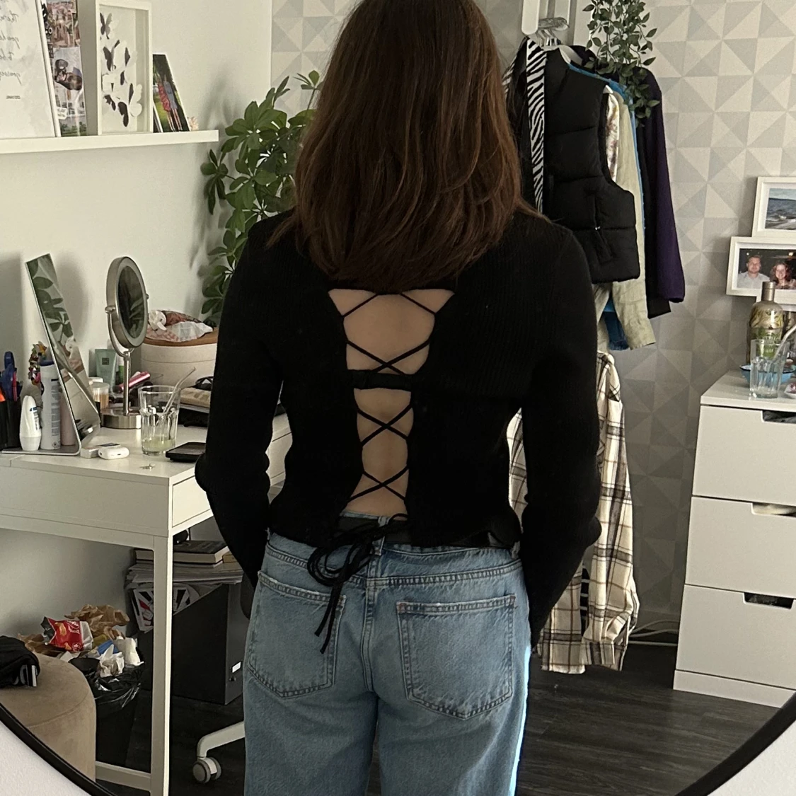 Säljer min svarta tröja ribbad och långärmad med knytningar på ryggen och polokrage, den är i bra skick, från GinaTricot i storlek M😊