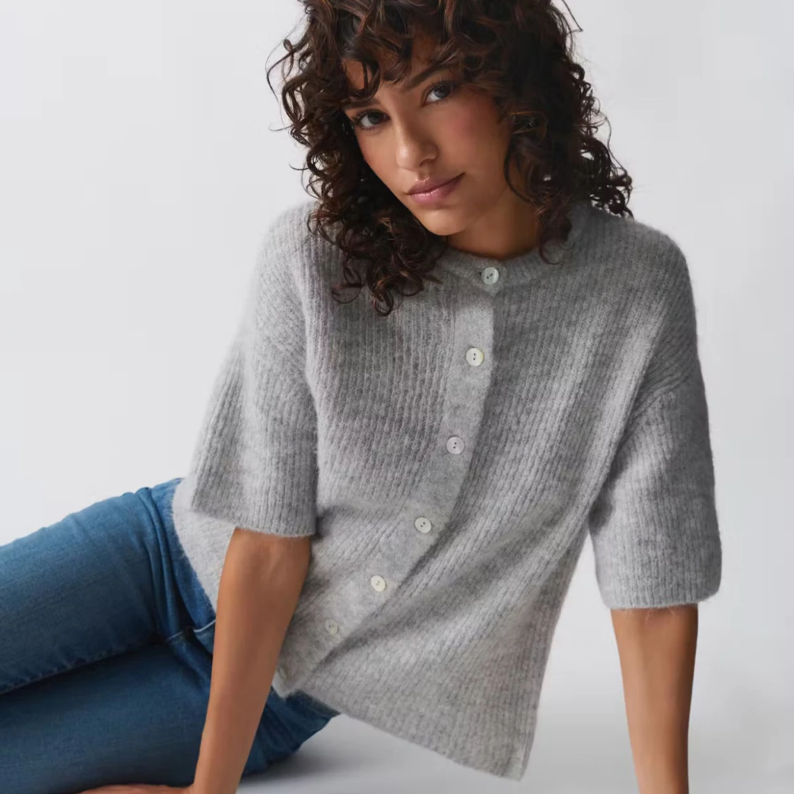 Grå stickad kortärmad kofta från Gina