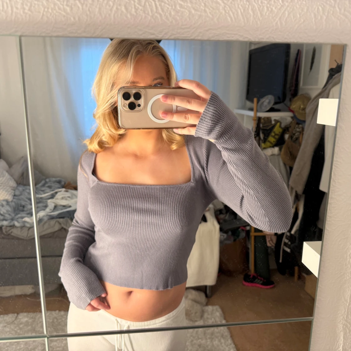 Säljer en grå croppad topp med lång ärm och fyrkantig urringning. Toppen är ribbad och har en slim passform som sitter snyggt på kroppen. Perfekt för dig som gillar stilrena och enkla plagg med en modern touch. Storlek L men passar mig som brukar ha M