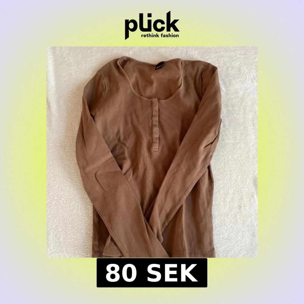 Säljer en brun ribbad långärmad topp från Gina Tricot. Toppen har en rund halsringning med knappar framtill. Perfekt för en avslappnad stil.