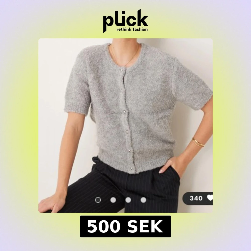 Mysig grå stickad kofta med korta ärmar och rund hals. Koftan har pärlknappar framtill och är tillverkad i ett fluffigt, mjukt material som ger en chill och trendig vibe. Perfekt att slänga över en topp för extra stilpoäng.