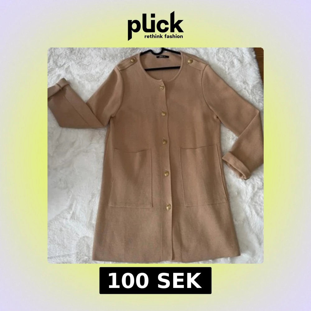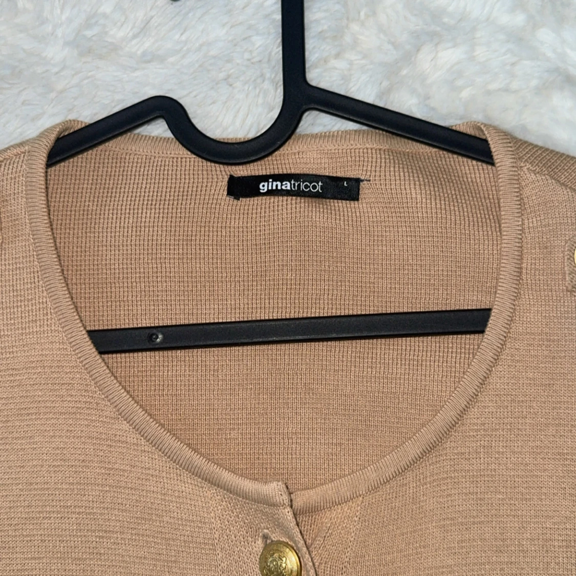 Snygg beige cardigan jacka från Gina Tricot med guldknappar och stora fickor framtill. Jackan har rund halsringning, långa ärmar och axelremmar med knappdetalj.