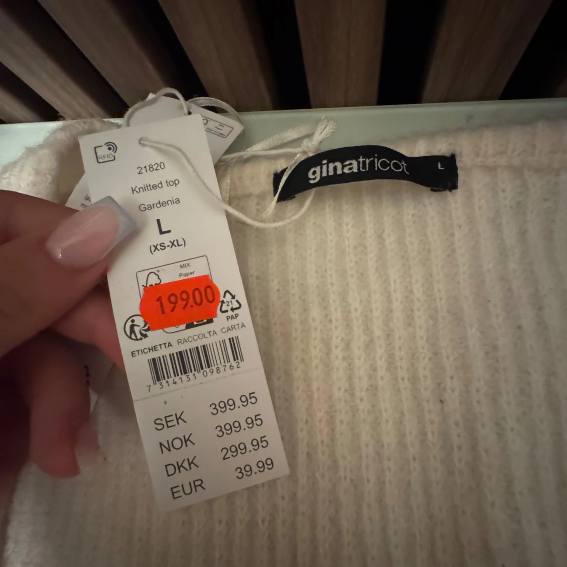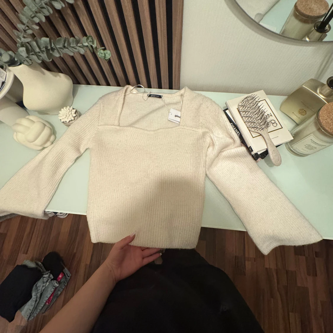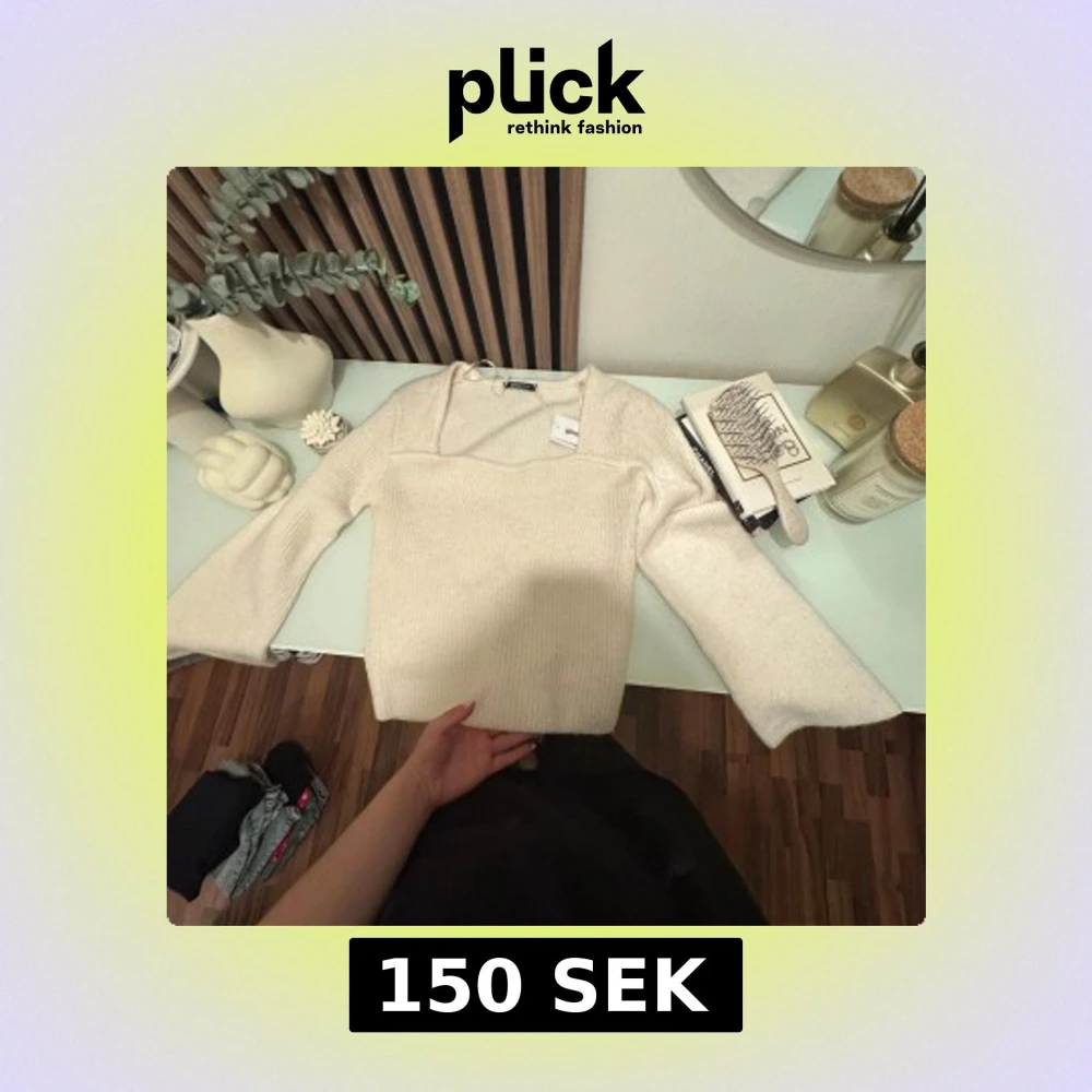 Superfin vit stickad tröja från Gina Tricot i storlek L. Tröjan har lång ärm, lätt utsvängda ärmslut och en snygg fyrkantig ringning. Perfekt för lager-på-lager och passar till både jeans och kjol. Mjuk och skön känsla.