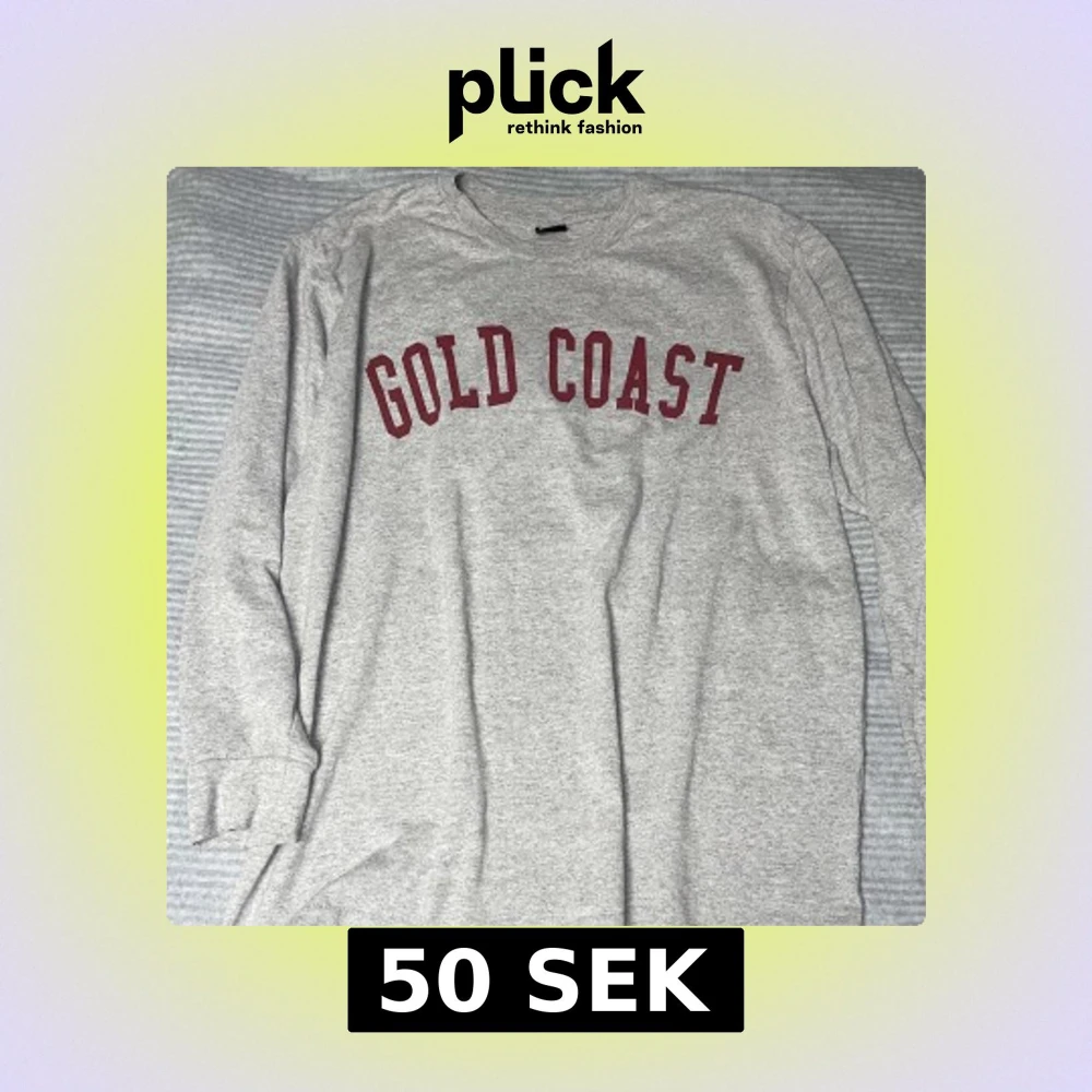 Säljer en grå långärmad tröja från Gina Tricot med texten 'GOLD COAST' i rött på framsidan. Perfekt för en avslappnad stil.