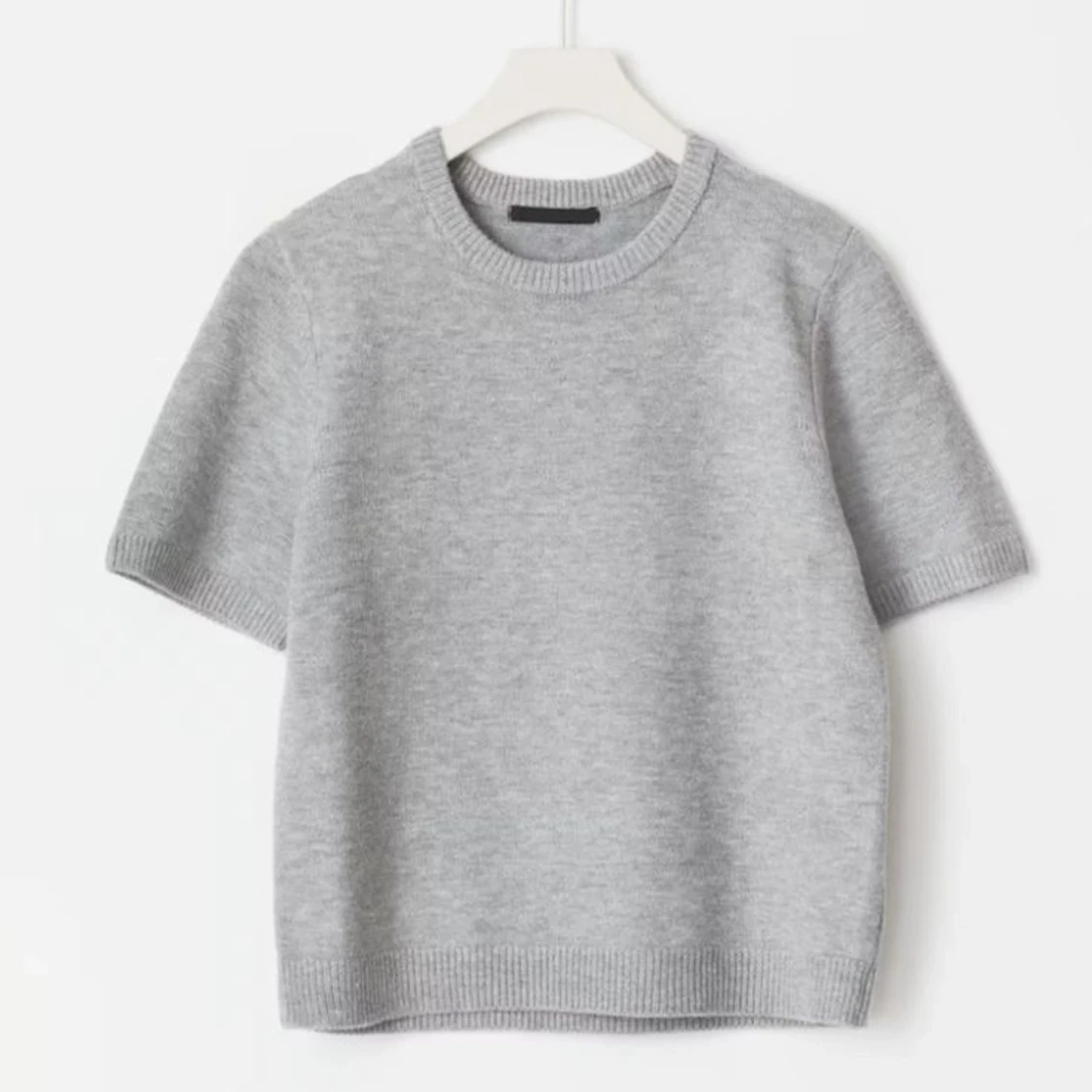 Supermysig ljusgrå stickad tröja med korta ärmar och ribbade kanter vid hals, ärmslut och nederkant. Perfekt för lager-på-lager och chill vibes. Enkel och stilren design som funkar till det mesta.