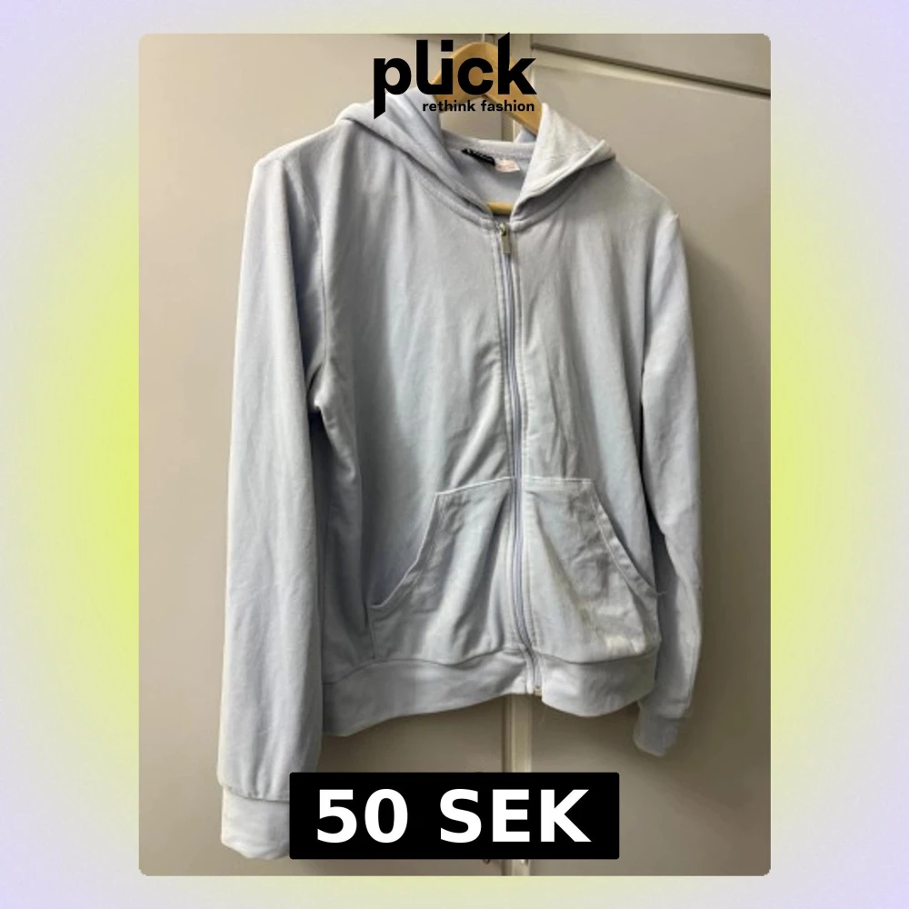 Säljer en ljusblå velour hoodie från Gina Tricot i mjuk polyester. Tröjan har huva, dragkedja framtill och två stora fickor. Perfekt för chill dagar och enkel att matcha med jeans eller mjukisbyxor. Långärmad och med normal passform. Snören saknas till luvan.