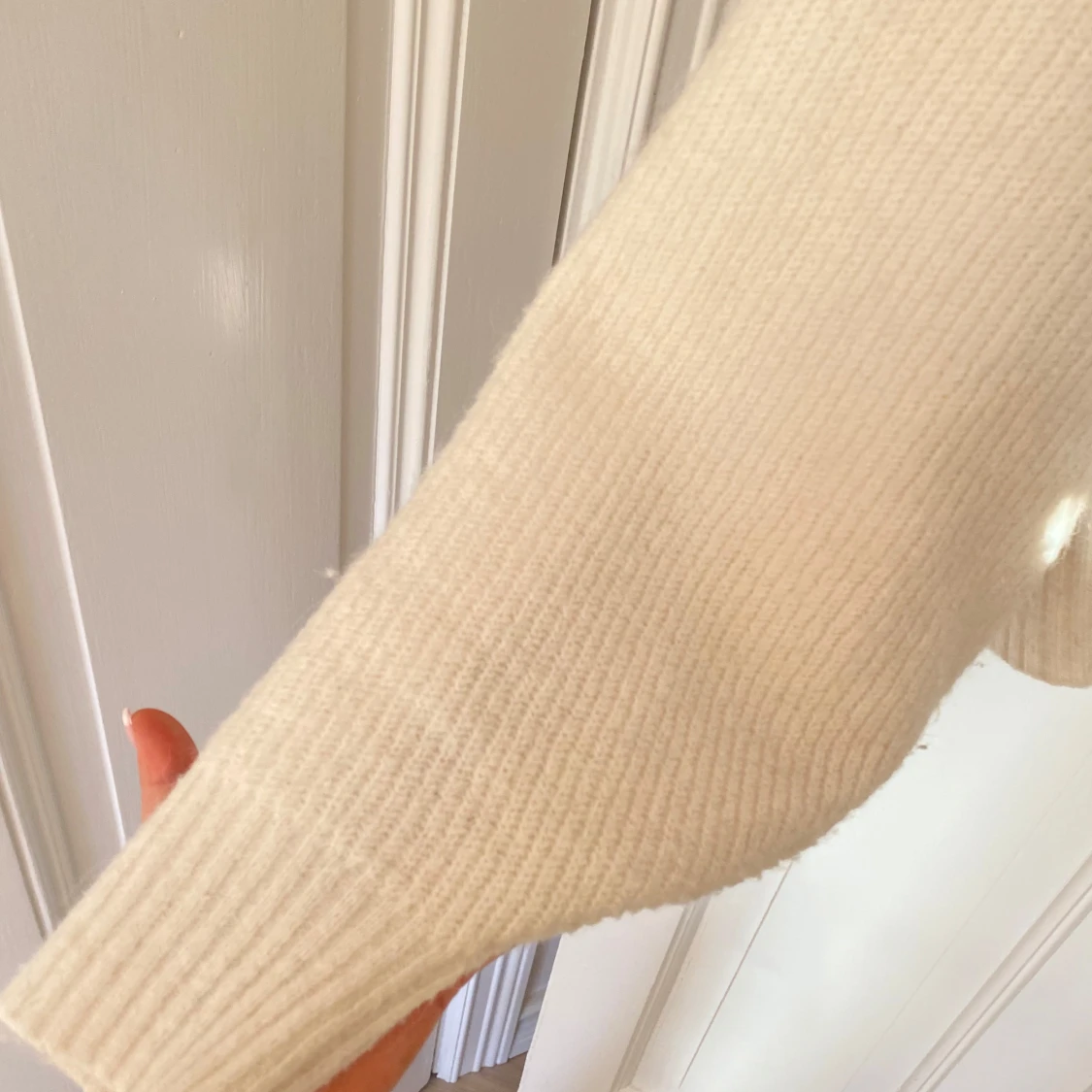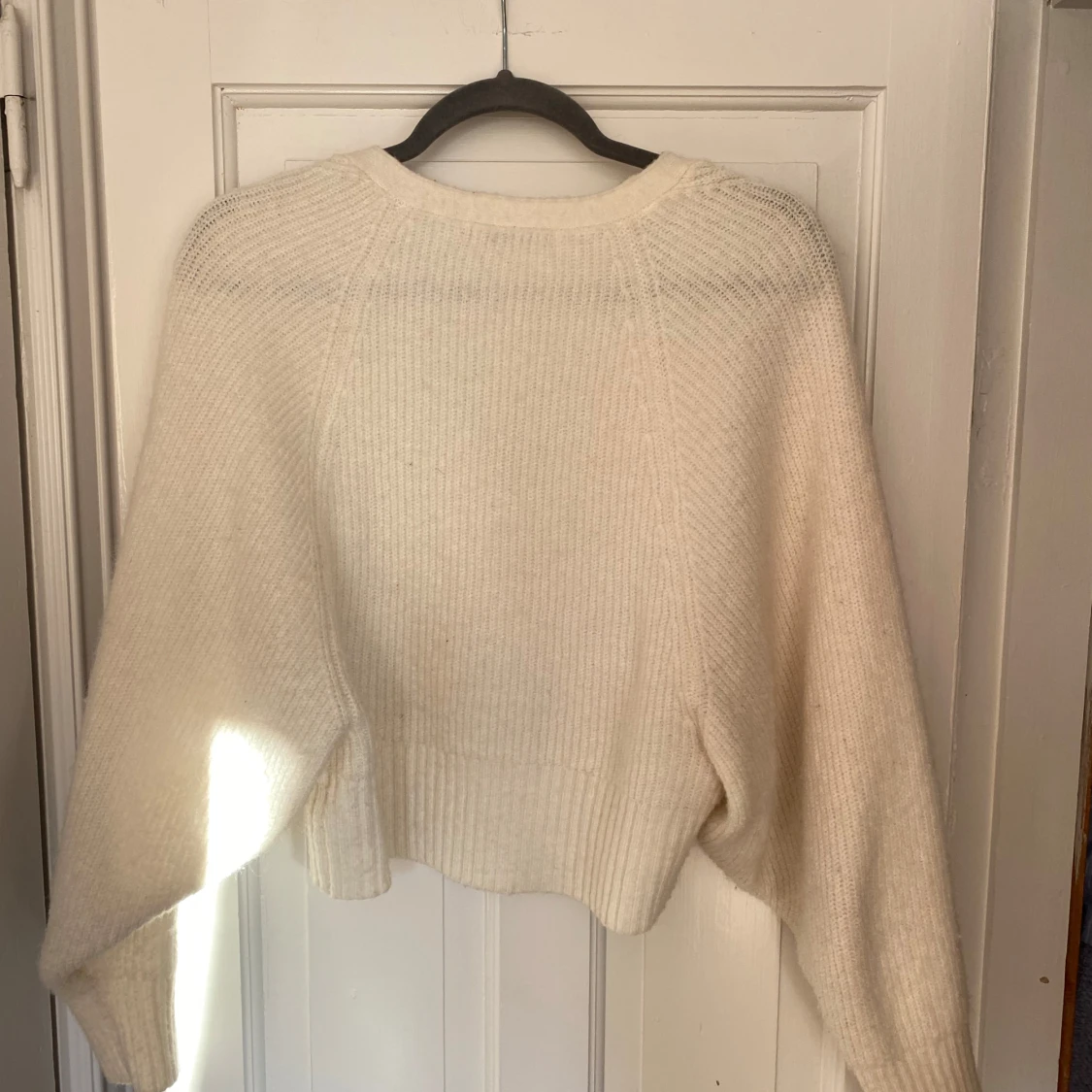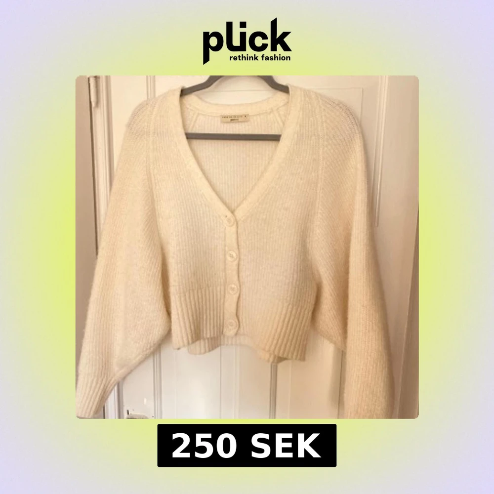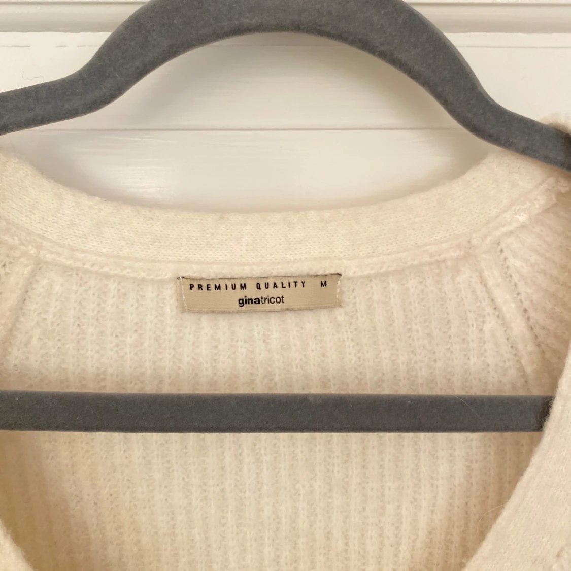 Mysig beige stickad kofta med ballongärm från Gina Tricot med knappar framtill och en v-ringad design. Perfekt för kyliga dagar med sin ribbade struktur och långa ärmar. En stilren och bekväm tröja för alla tillfällen.