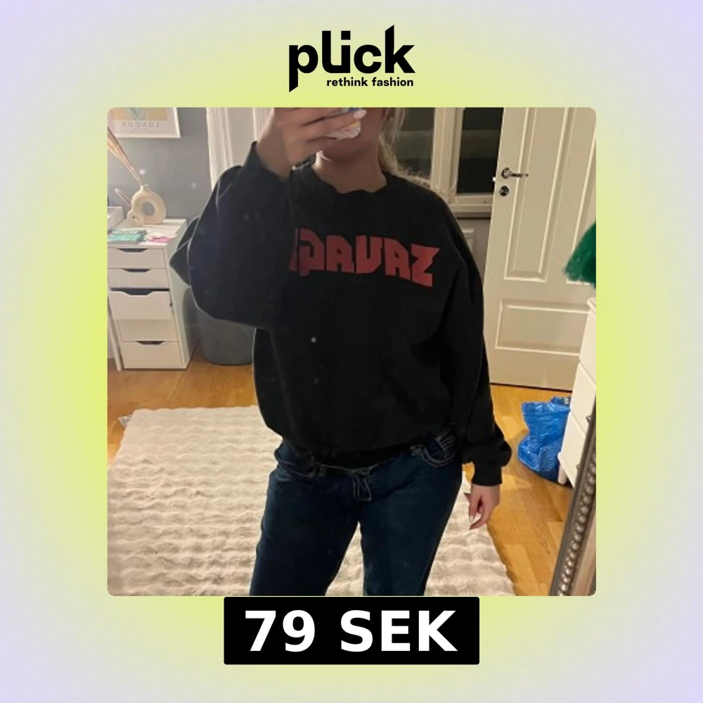 Svart sweatshirt från Gina Tricot med röd text framtill. Tröjan har en avslappnad passform, rund halsringning och långa ärmar med ribbade muddar. Perfekt för en chill och snygg vardagslook.