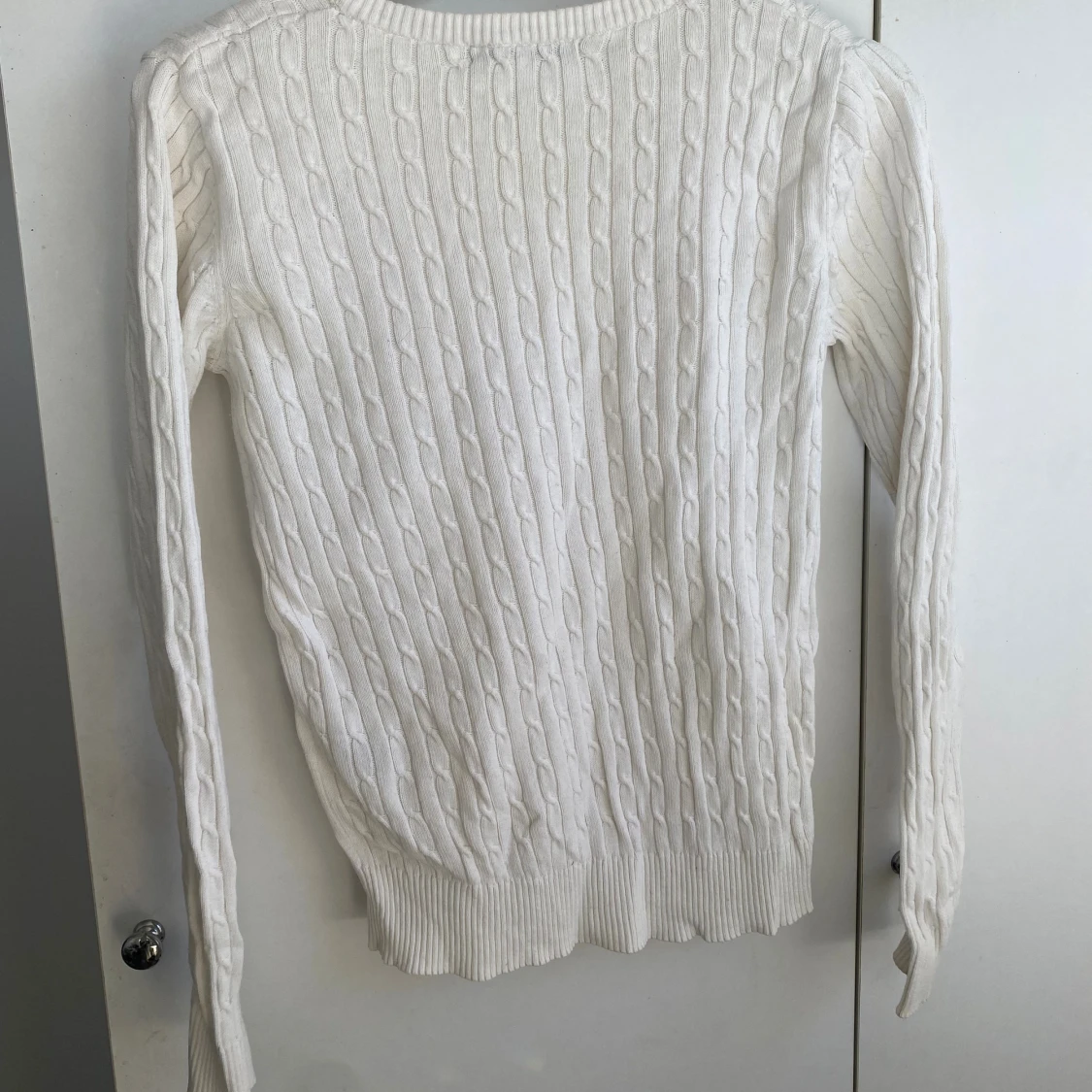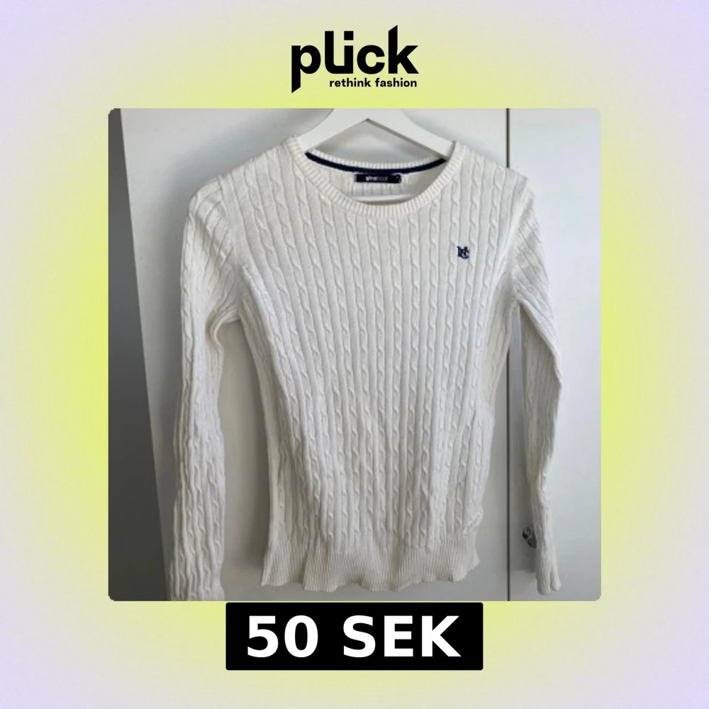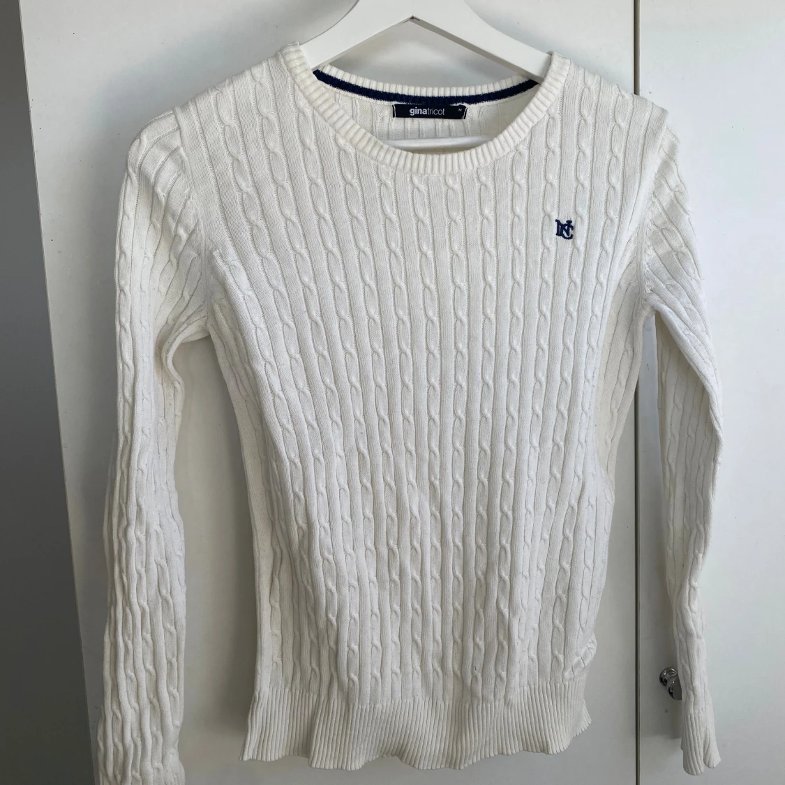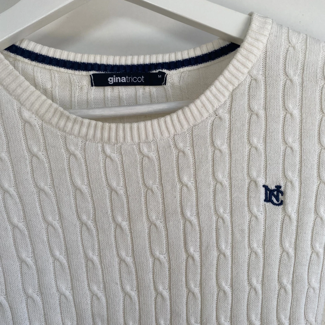 Vit kabelstickad tröja från Gina Tricot med rund halsringning och diskret blå brodyr på bröstet.