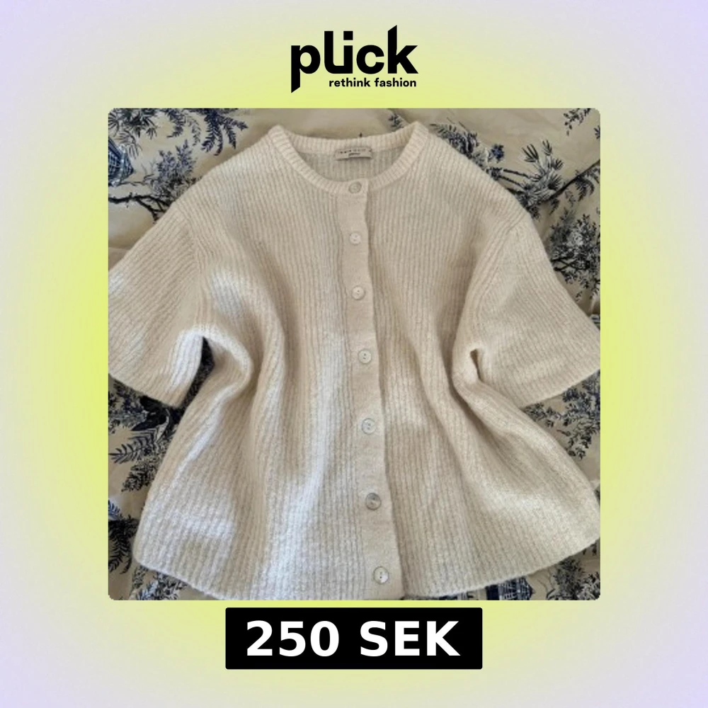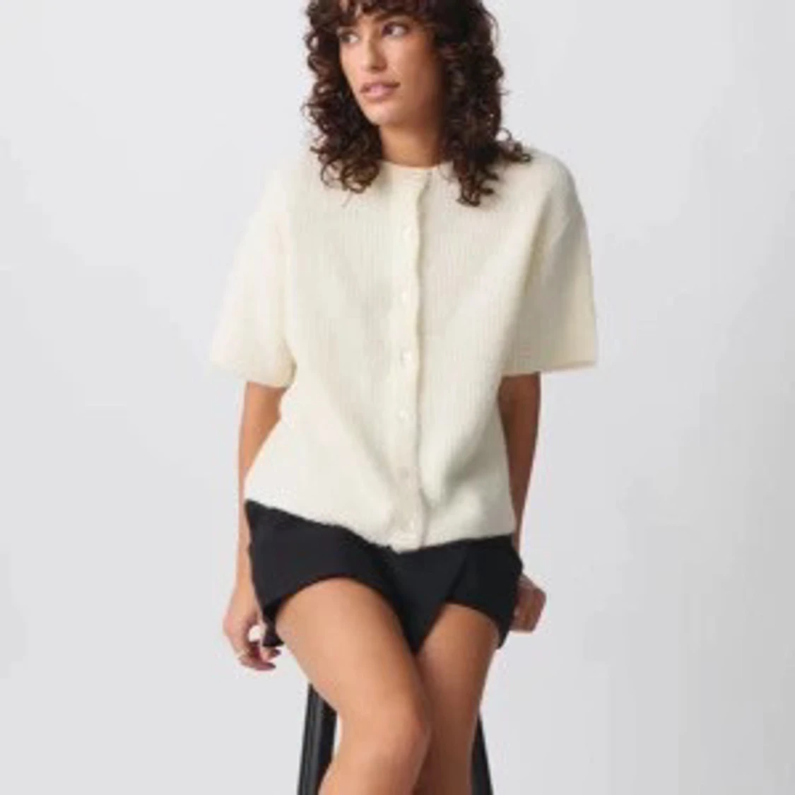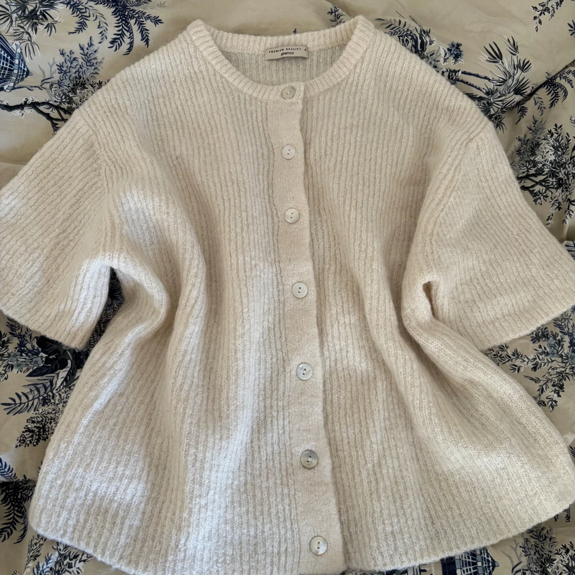 Säljer en mysig vit kortärmad kofta från Gina Tricot i storlek M. Koftan är ribbad och har korta ärmar med knappar framtill. Perfekt för en stilren och bekväm look.