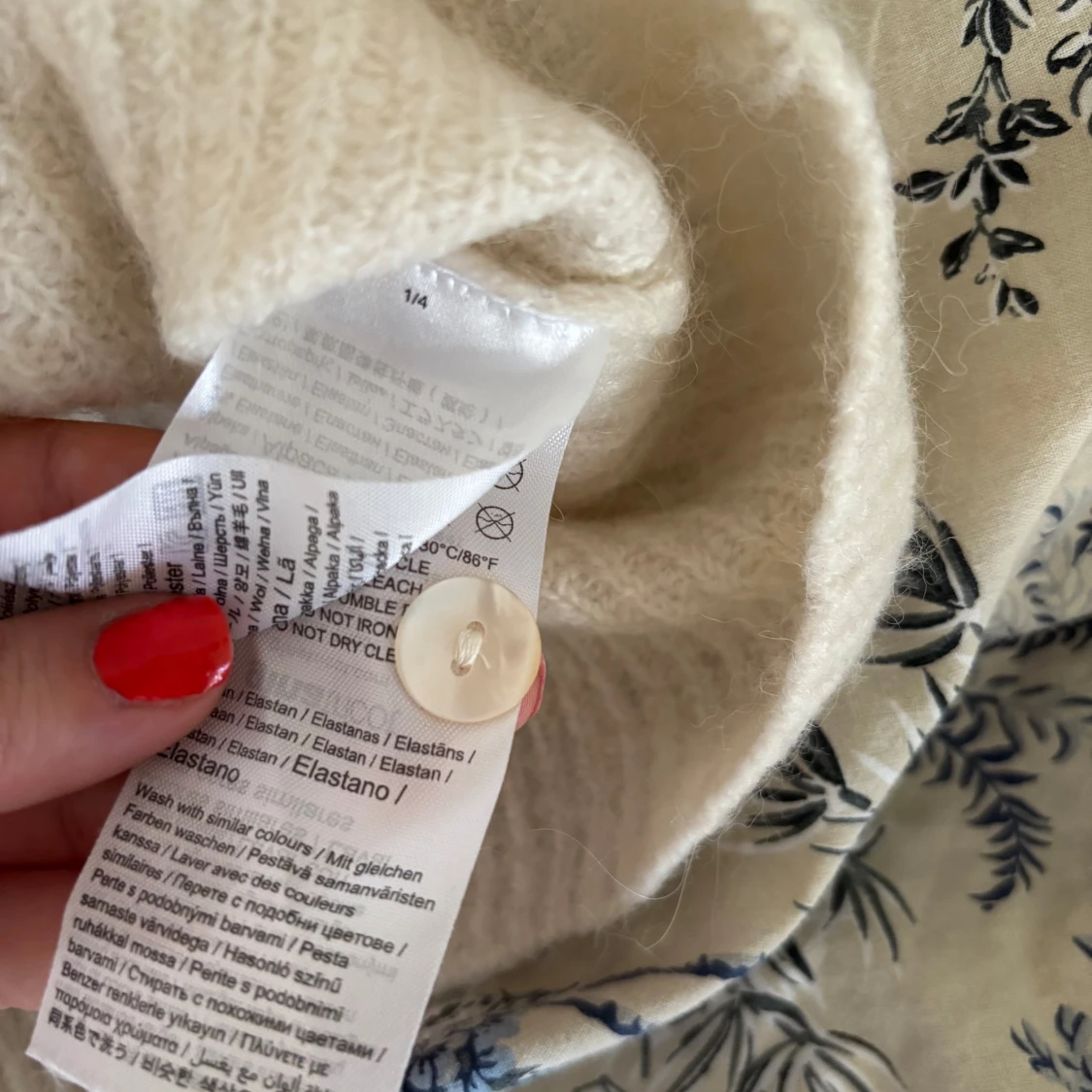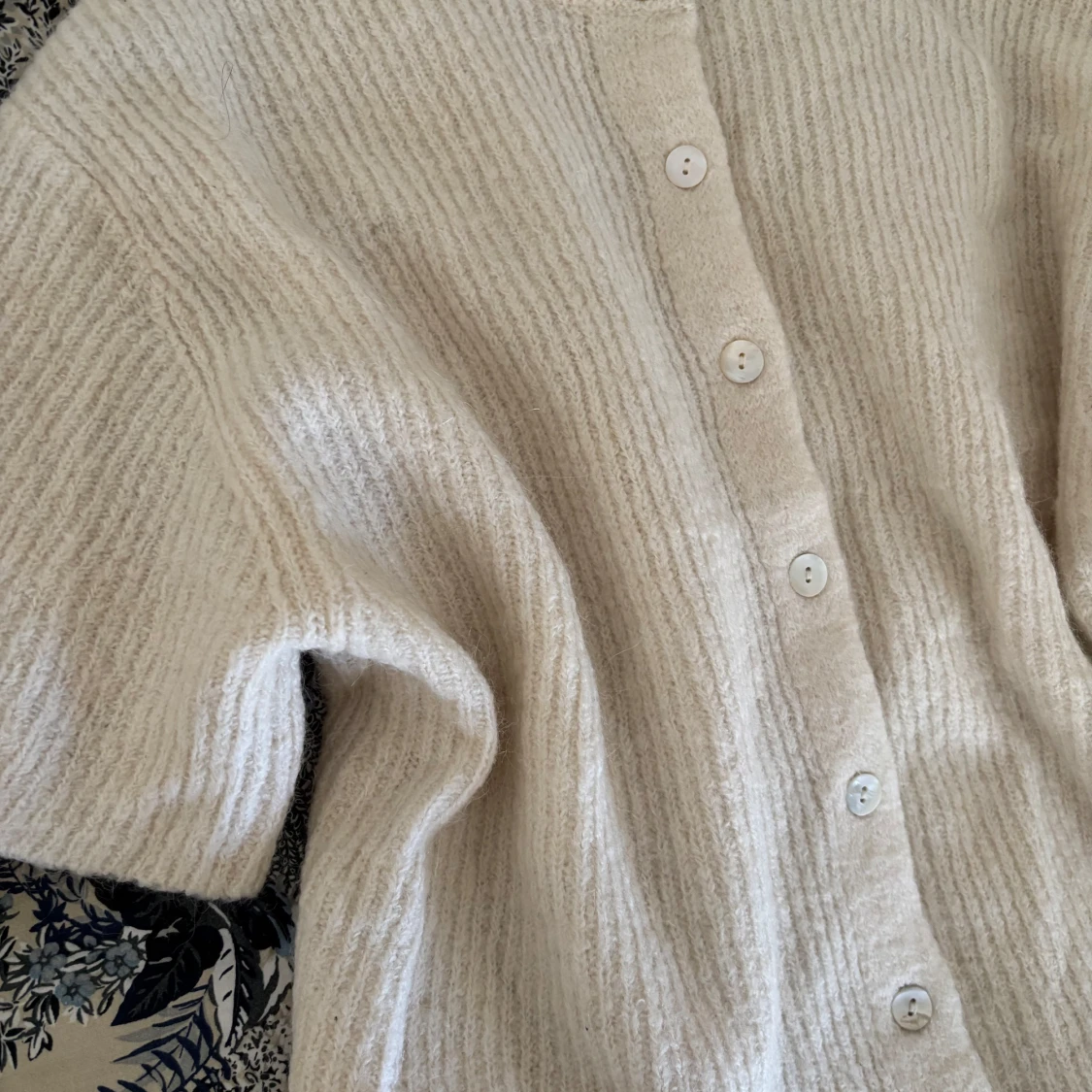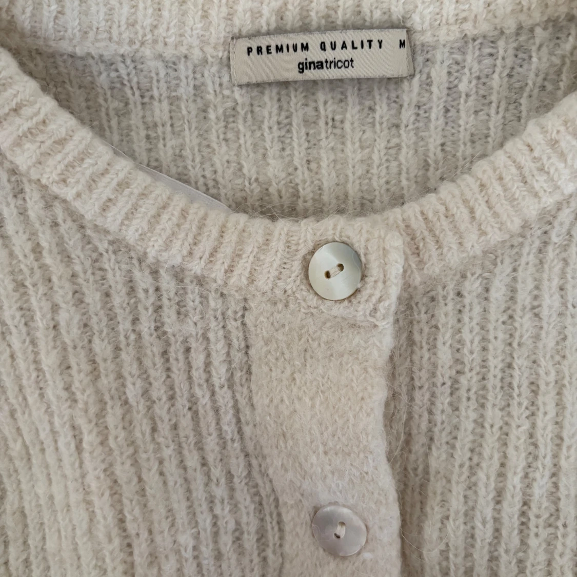 Säljer en mysig vit kortärmad kofta från Gina Tricot i storlek M. Koftan är ribbad och har korta ärmar med knappar framtill. Perfekt för en stilren och bekväm look.