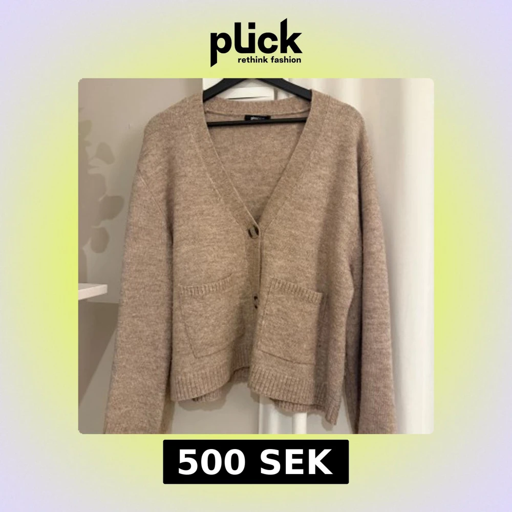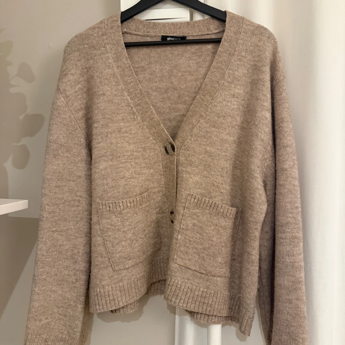 Mysig beige kofta från Gina Tricot med v-ringning, två stora fickor framtill och knappar. Koftan är stickad och har långa ärmar samt ribbade detaljer vid ärmslut och nederkant. Perfekt för lager-på-lager-stil.
