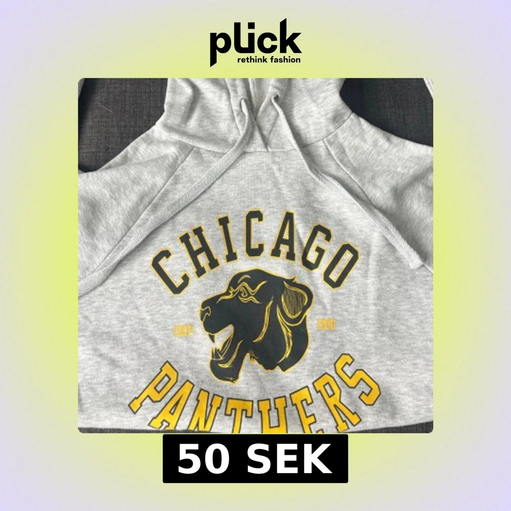 Grå hoodie från Gina Tricot med tryck 'Chicago Panthers' i svart och gult på framsidan. Tröjan har huva med snörning och mjukt fleecefoder på insidan. Snyggt sportigt motiv med panterhuvud och kontrasterande detaljer.