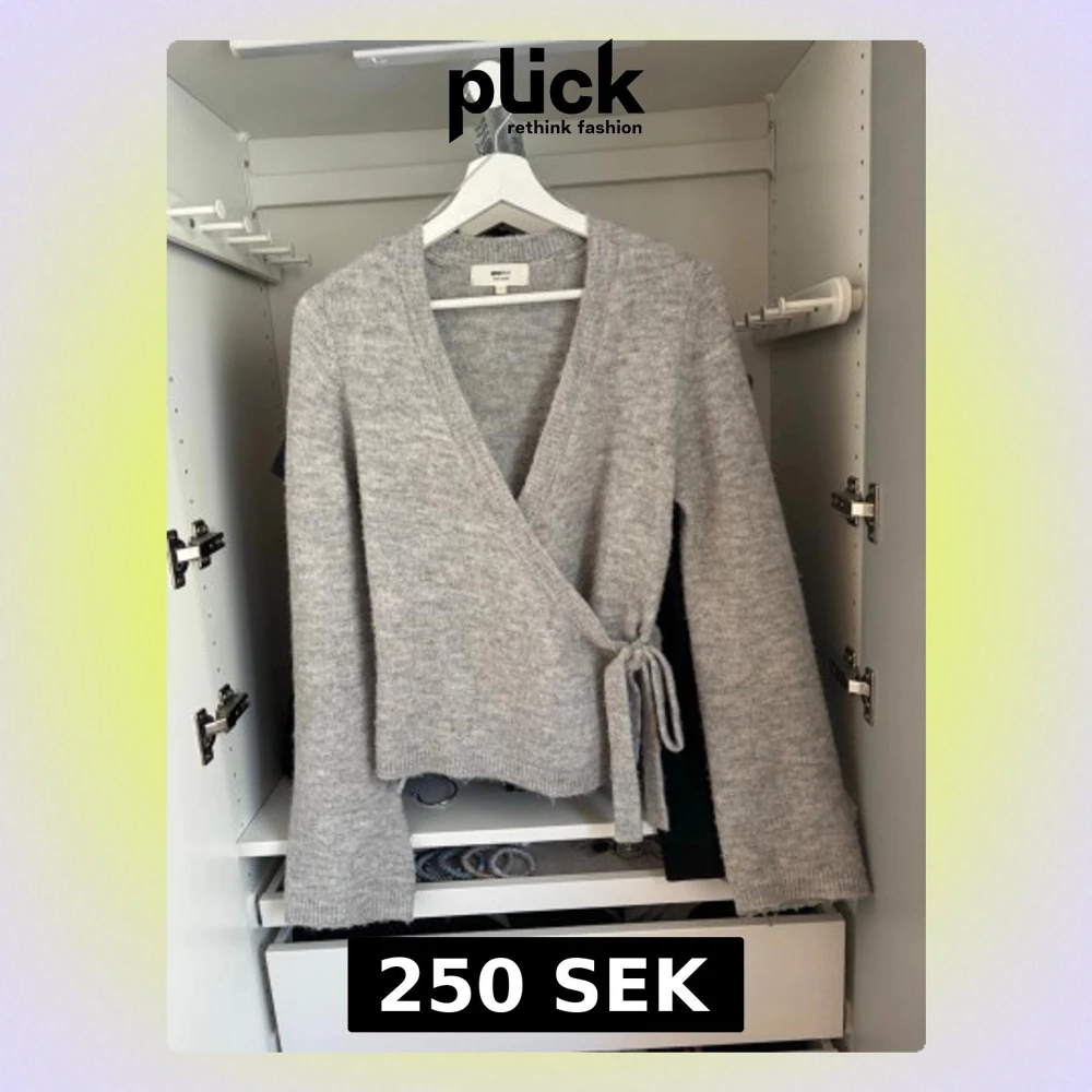 Mysig grå omlottkofta från Gina Tricot med knytband i sidan. Koftan har lång ärm, djup v-ringning och är stickad i ett mjukt