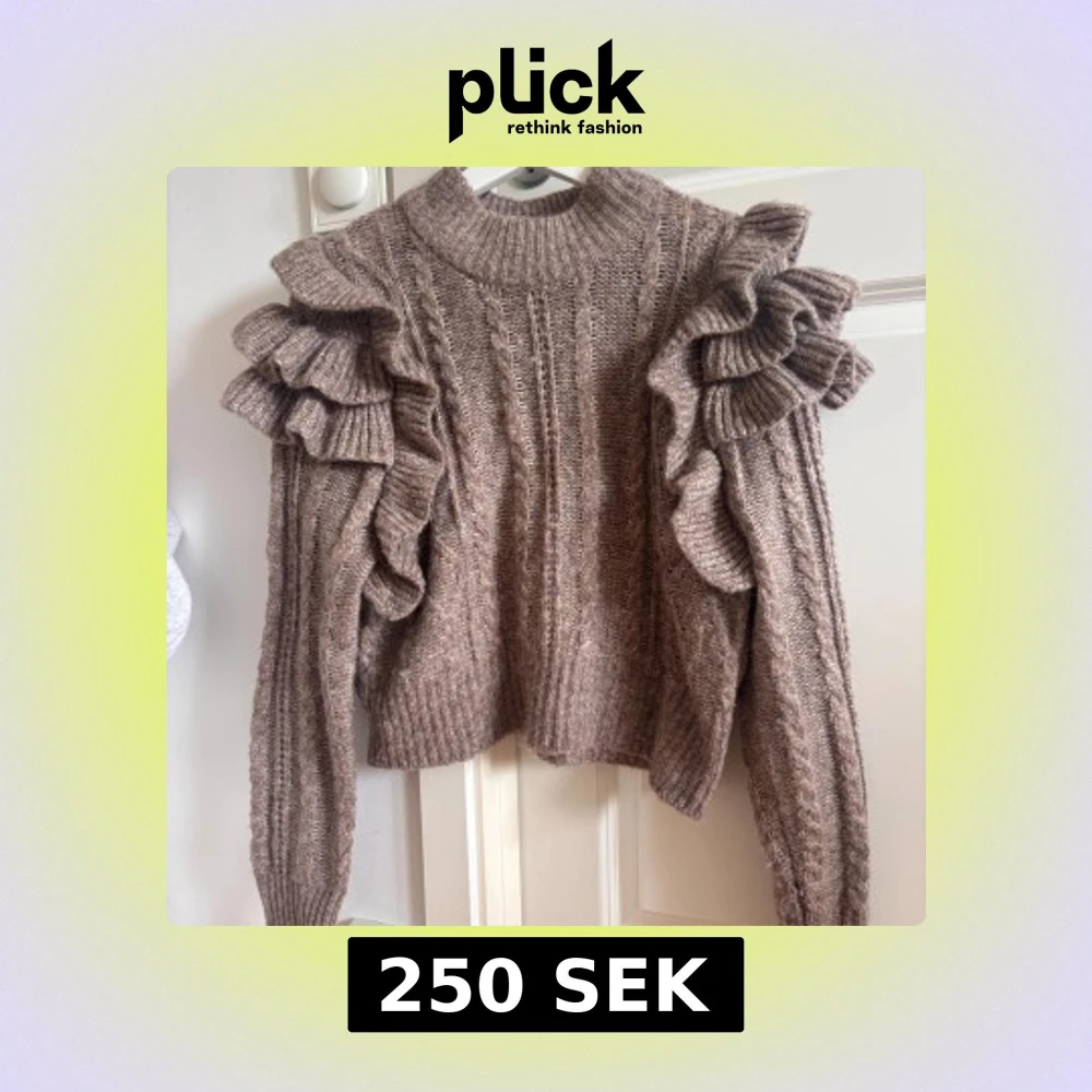 Säljer en brun stickad tröja från Gina Tricot i storlek M. Tröjan har höga ribbade muddar, kabelstickat mönster och volanger på axlarna som ger en cool och unik look. Storlek m men kan upplevas lite mindre!